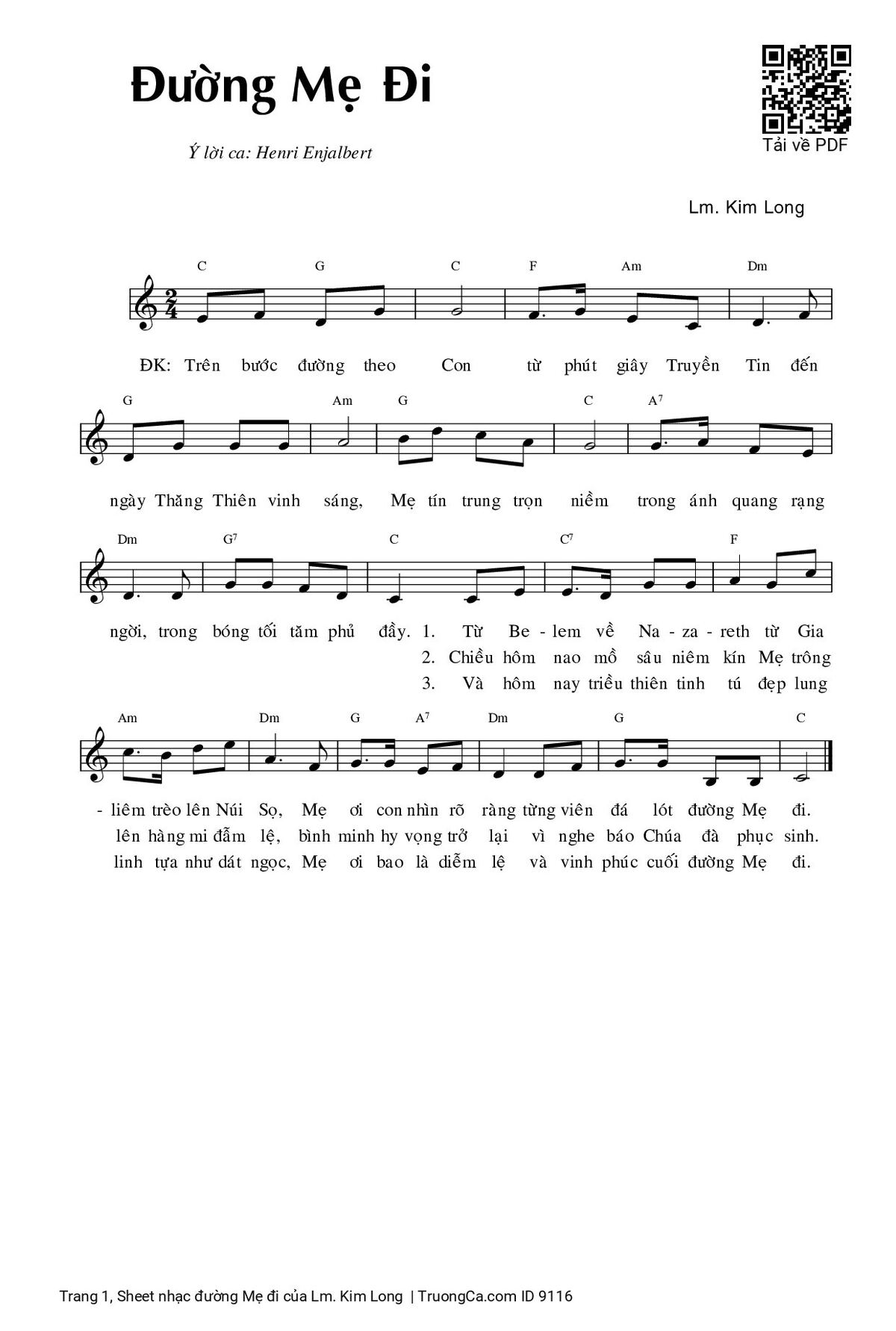 Điệp khúc. Trên bước đường theo Con từ phút giây truyền tin đến ngày Thăng Thiên vinh sáng. Mẹ tín trung trọn niềm trong ánh quang rạng ngời trong bóng tối tăm phủ đầy