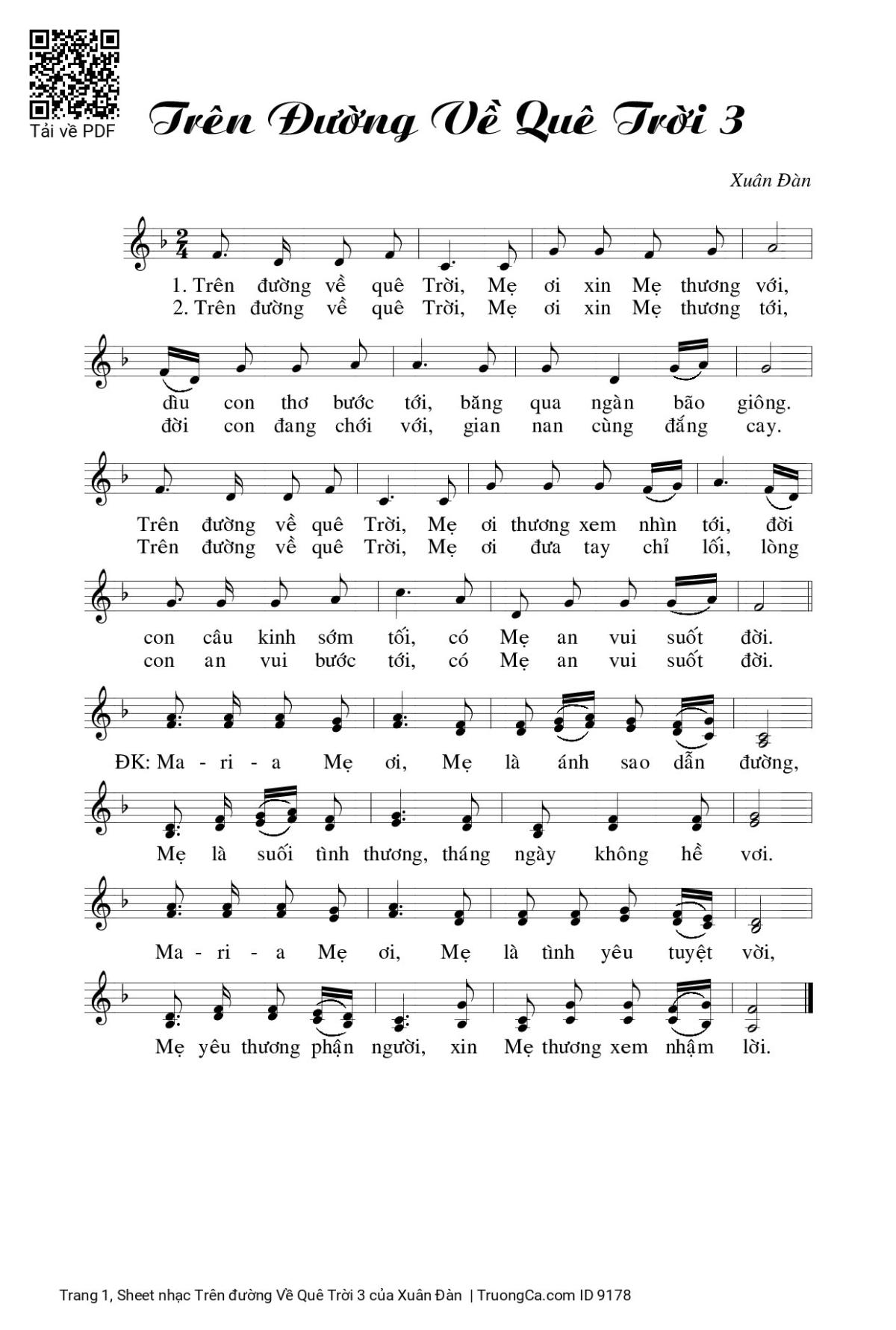 1. Trên đường về quê Trời, Mẹ ơi xin Mẹ thương với, dìu con thơ bước tới, băng qua ngàn bão giông. Trên đường về quê Trời, Mẹ ơi thương xem nhìn tới, đời con câu kinh sớm tối, có Mẹ an vui suốt đời.