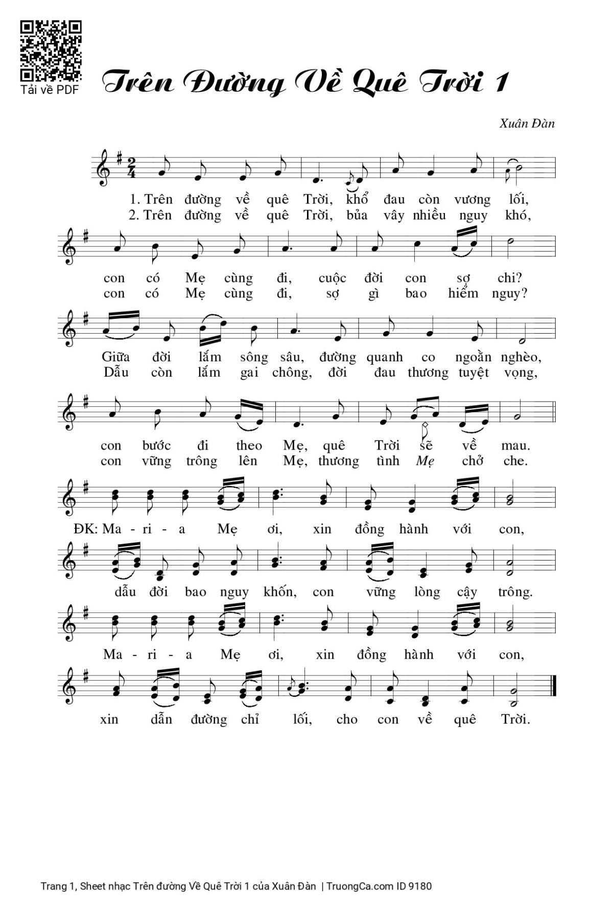 1. Trên đường về quê Trời, khổ đau còn vương lối, con có Mẹ cùng đi, cuộc đời con sợ chi? Giữa đời lắm sông sâu, đường quanh co ngoằn nghèo, con bước đi theo Mẹ, quê Trời sẽ về mau.
