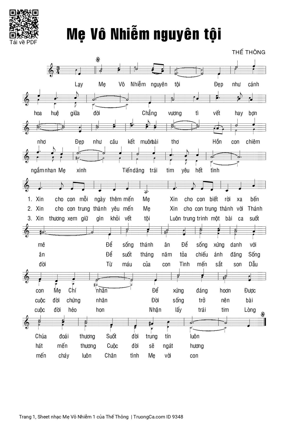 3. Xin thương xem giữ gìn khỏi vết tội Luôn trung trinh một bài ca suốt đời Từ máu của con Tình mến sắt son Dẫu cuộc đời héo hon Nhận lấy trái tim Lòng mến cháy luôn Chân tình Mẹ với con