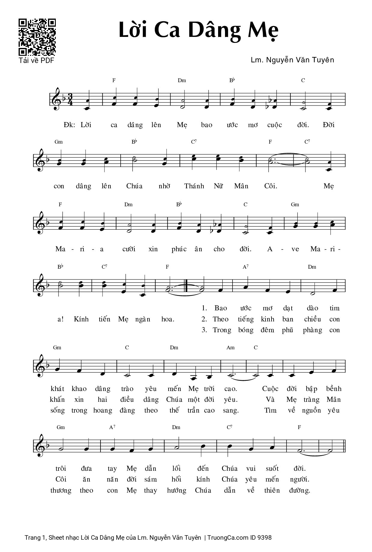 Điệp khúc. Lời ca dâng lên Mẹ bao ước mơ cuộc đời. Đời con dâng lên Chúa nhờ Thánh Nữ Mân Côi. Mẹ Ma - ri - a cười xin phúc ân cho đời. A - ve Ma - ri - a! Kính tiến Mẹ ngàn hoa.