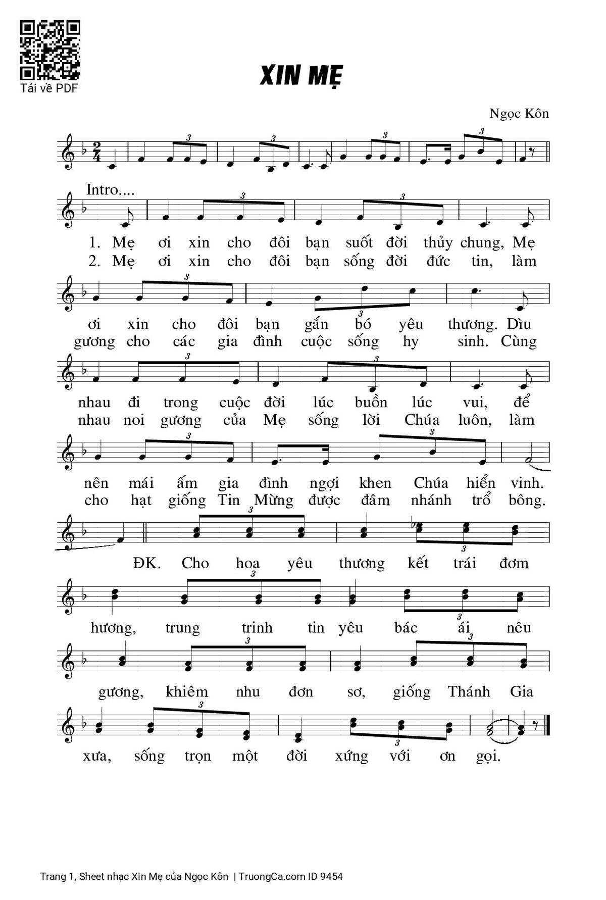 1. Mẹ ơi xin cho đôi bạn suốt đời thủy chung. Mẹ ơi xin cho đôi bạn gắn bó yêu thương. Dìu nhau đi trong cuộc đời lúc buồn lúc vui. Để nên mái ấm gia đình ngợi khen Chúa hiển vinh.