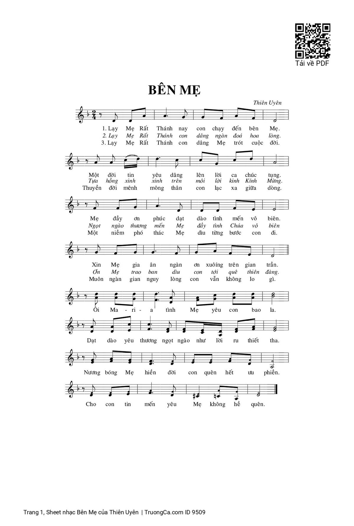 Điệp khúc. Ôi Ma - ri - a tình Mẹ yêu con bao la. Dạt dào yêu thương ngọt ngào như lời ru thiết tha. Nương bóng Mẹ hiền đời con quên hết ưu phiền. Cho con tin mến yêu Mẹ không hề quên.