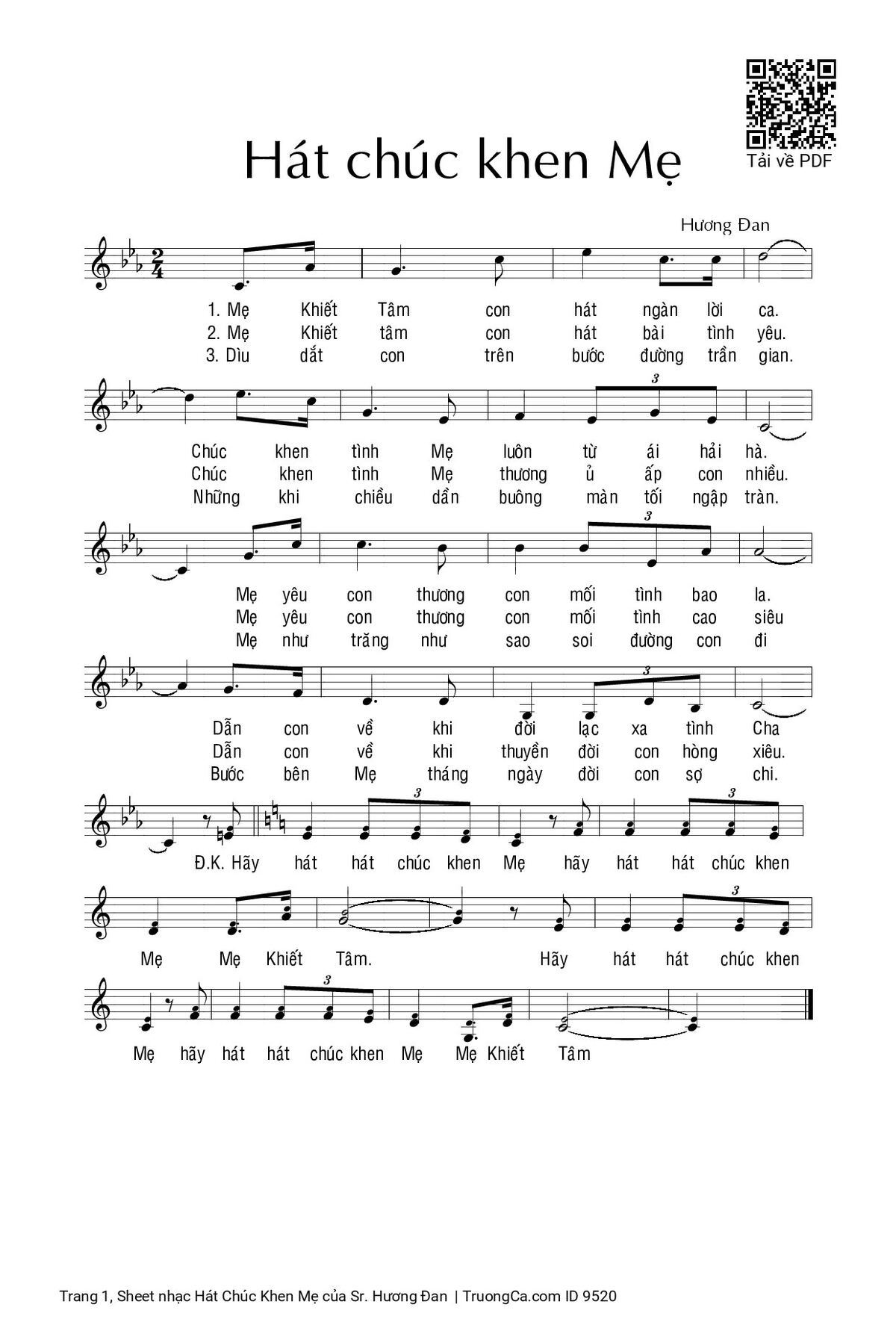 Điệp khúc: Hãy hát hát chúc khen Mẹ hãy hát hát chúc khen Mẹ Mẹ Khiết Tâm. Hãy hát hát chúc khen Mẹ hãy hát hát chúc khen Mẹ Mẹ Khiết Tâm