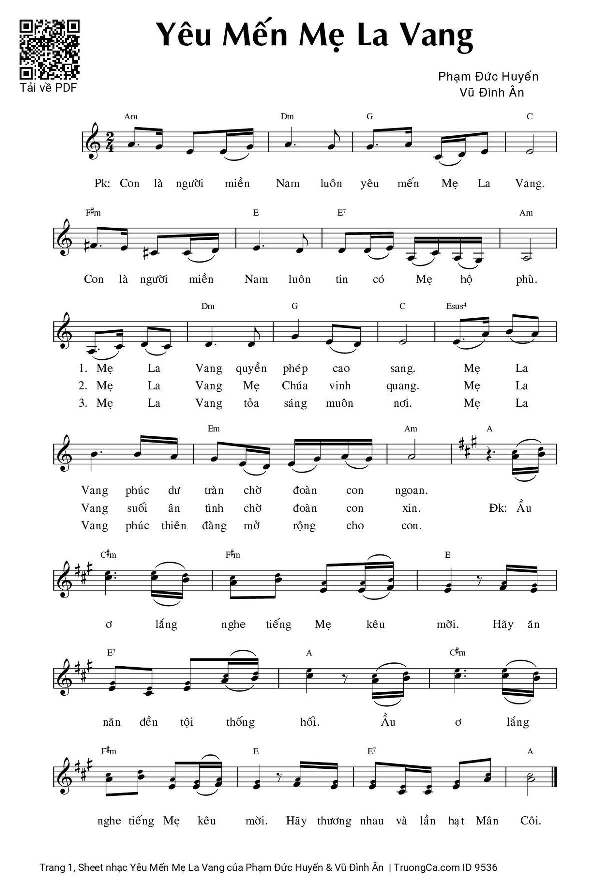 1. Mẹ La Vang quyền phép cao sang. Mẹ La Vang phúc dư tràn chờ đoàn con ngoan.