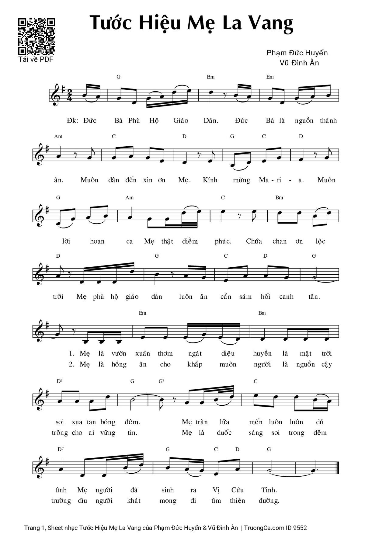 Điệp khúc. Đức Bà Phù Hộ Giáo Dân. Đức Bà là nguồn thánh ân. Muôn dân đến xin ơn Mẹ. Kính mừng Ma - ri - a. Muôn lời hoan ca Mẹ thật diễm phúc. Chứa chan ơn lộc trời Mẹ phù hộ giáo dân luôn ân cần sám hối canh tân.
