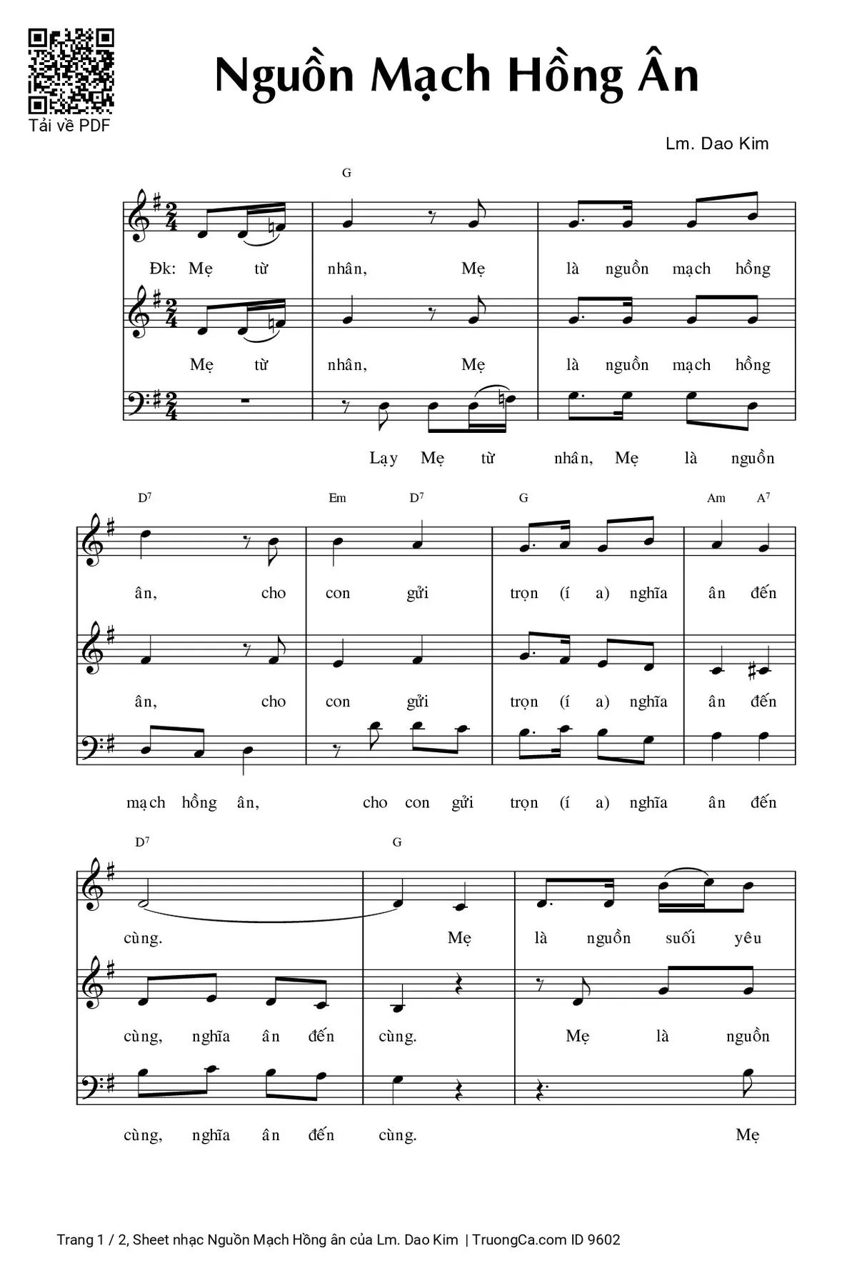 Điệp khúc. Mẹ từ nhân, Mẹ là nguồn mạch hồng ân, cho con gửi trọn (í a) nghĩa ân đến cùng. Mẹ là nguồn suối yêu thương, cho con no thỏa (í a) tấm lòng, tấm lòng khát khao.