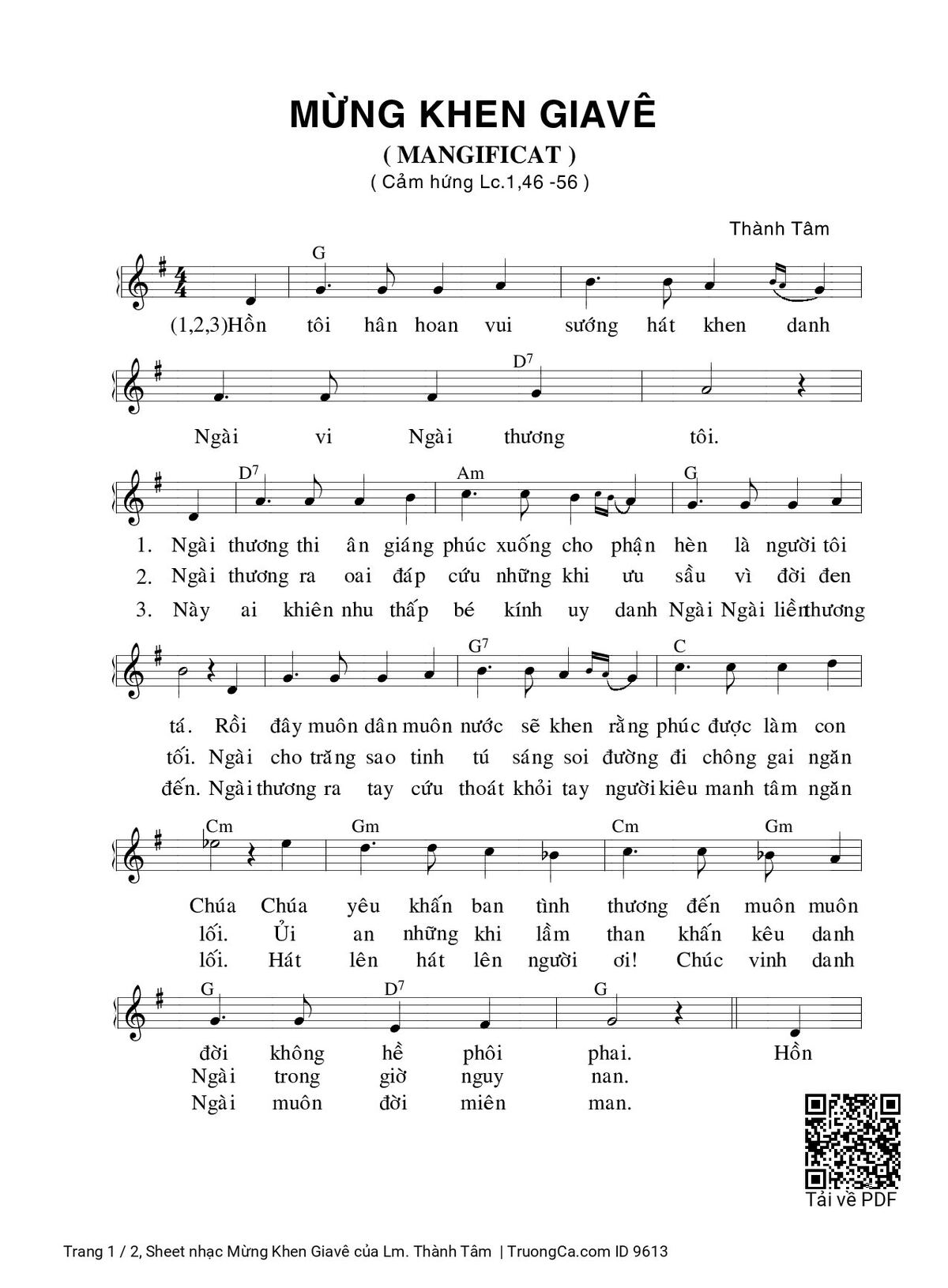 1. Hồn tôi hân hoan vui sướng hát khen Danh Ngài vì Ngài thương tôi. Ngài thương thi ân giáng phúc xuống cho phận hèn là người tôi tớ. Rồi đây muôn dân muôn nước sẽ khen rằng phúc được làm con Chúa. Chúa yêu khấn ban tình thương đến muôn muôn đời không hề phôi phai.