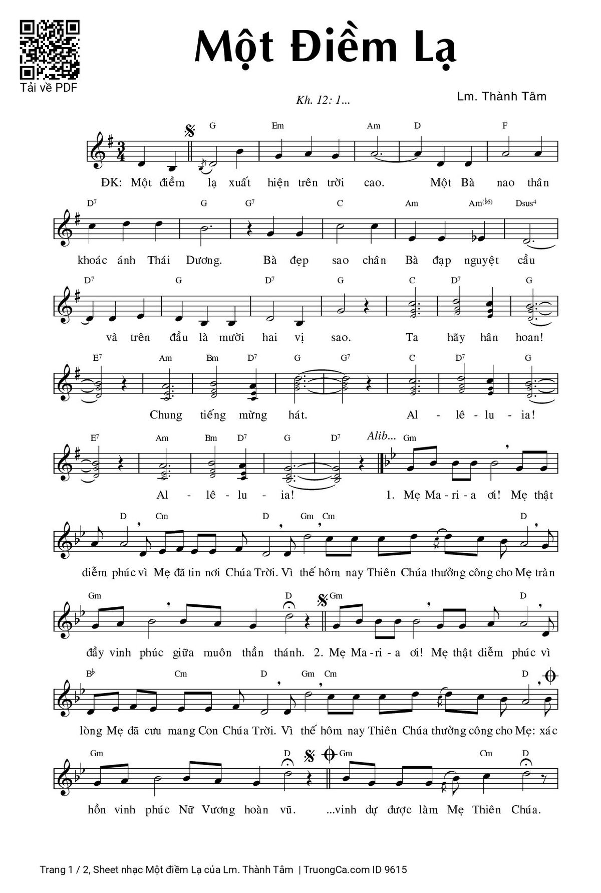 Điệp khúc. Một điềm lạ xuất hiện trên trời cao. Một Bà nao thân khoác ánh Thái Dương. Bà đẹp sao chân Bà đạp nguyệt cầu và trên đầu là mười hai vị sao. Ta hãy hân hoan! Chung tiếng mừng hát. Al - lê - lu - ia! Al - lê - lu - ia!