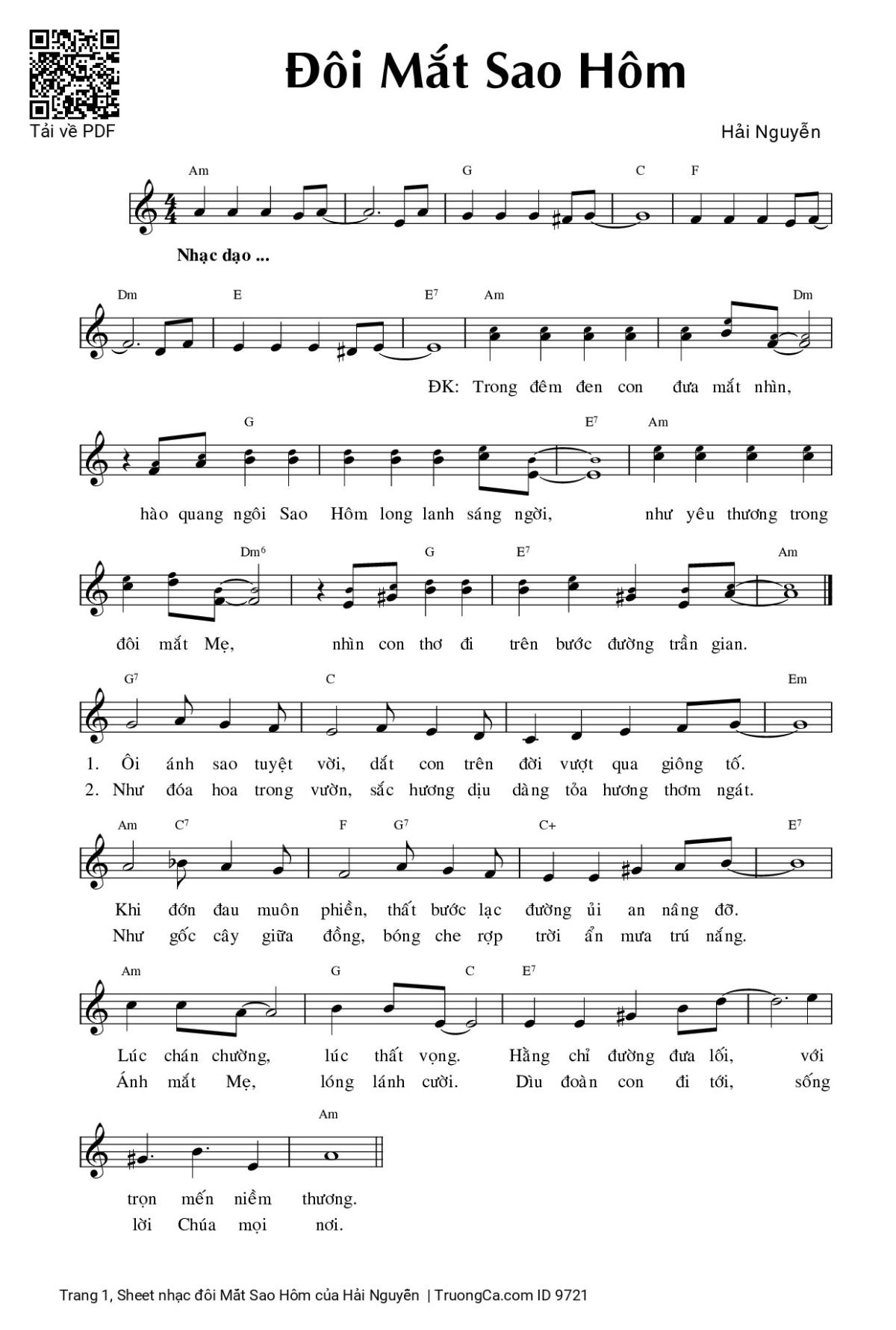 Điệp khúc: Trong đêm đen con đưa mắt nhìn, hào quang ngôi Sao Hôm long lanh sáng ngời, như yêu thương trong đôi mắt Mẹ, nhìn con thơ đi trên bước đường trần gian.