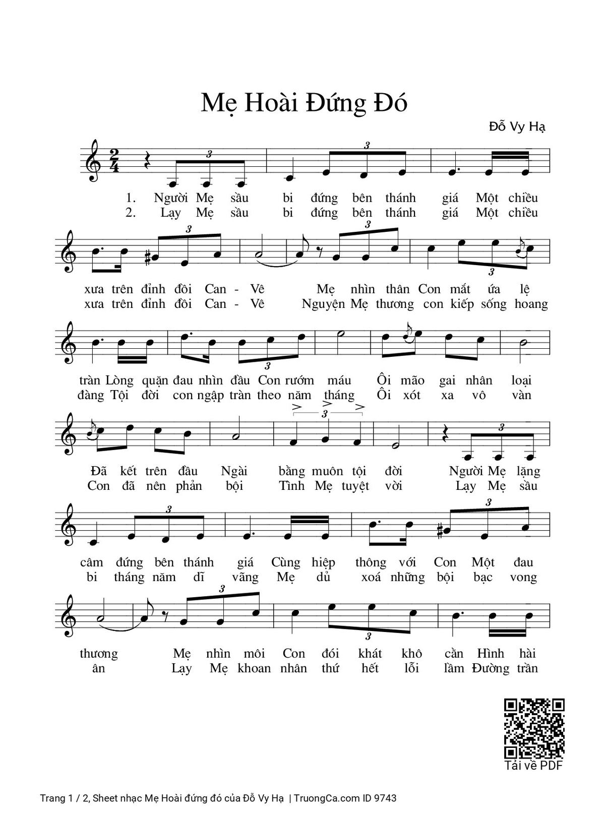 1. Người Mẹ sầu bi đứng bên Thánh giá, một chiều xưa trên đỉnh đồi Canvê. Mẹ nhìn thân Con mắt ứa lệ tràn. Lòng quặn đau nhìn đầu Con rướm máu. Ôi mão gai nhân loại đã kết trên đầu Ngài bằng muôn tội đời. Người Mẹ lặng câm đứng bên Thánh giá, cùng hiệp thông với Con Một đau thương. Mẹ nhìn môi Con đói khát khô cằn, hình hài Con trần truồng đầy thương tích. Ôi vết thương nhân loại, in dấu trên thân Ngài hằn những vô ân.