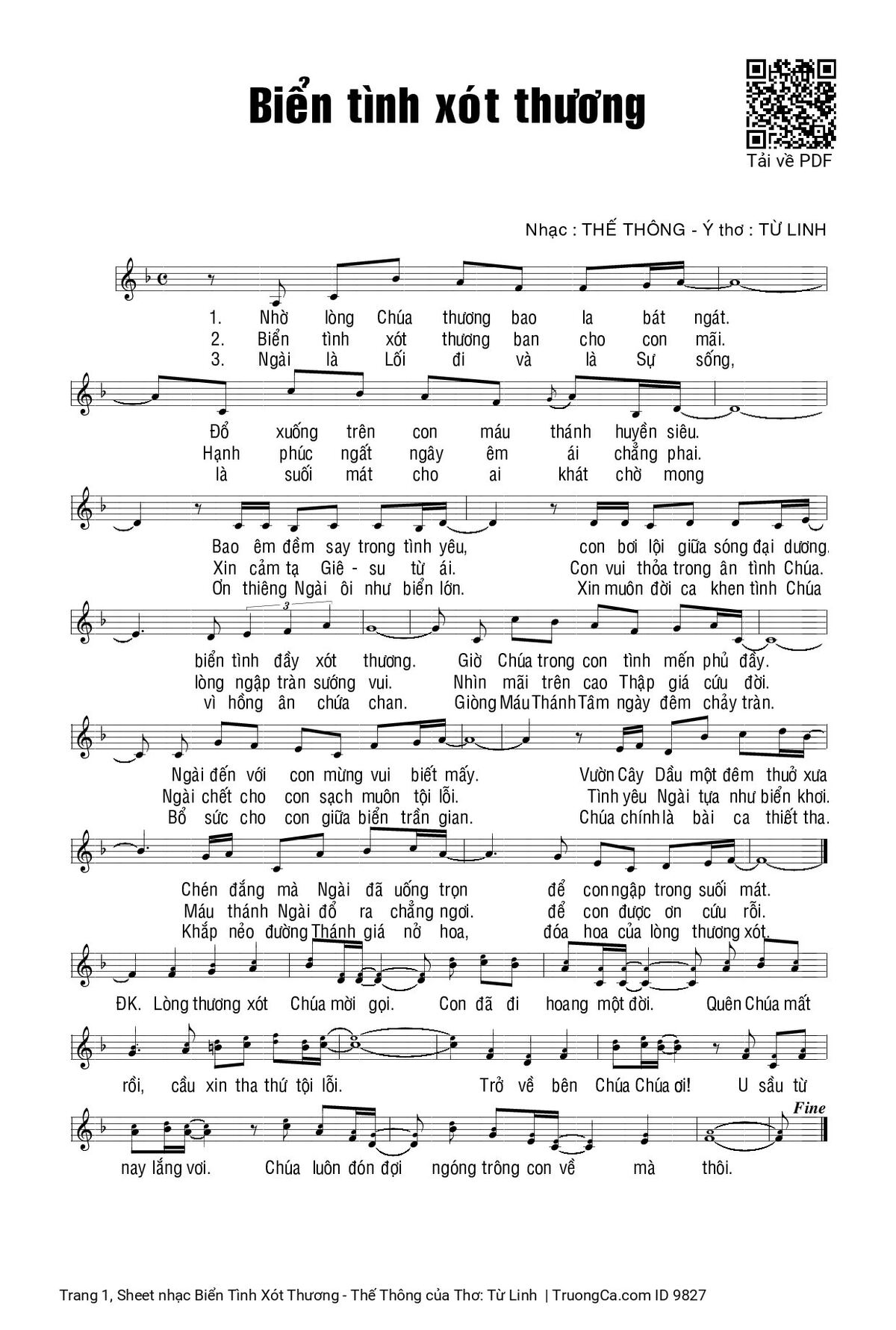 2/ Biển tình xót thương ban cho con mãi. Hạnh phúc ngất ngây êm ái chẳng phai. Xin cảm tạ Giê-su từ ái. Con vui thỏa trong ân tình Chúa. Lòng ngập tràn sướng vui. Nhìn mãi trên cao Thập giá cứu đời. Ngài chết cho con sạch muôn tội lỗi. Tình yêu Ngài tựa như biển khơi. Máu Thánh Ngài đổ ra chẳng ngơi. Để con được ơn cứu rỗi.