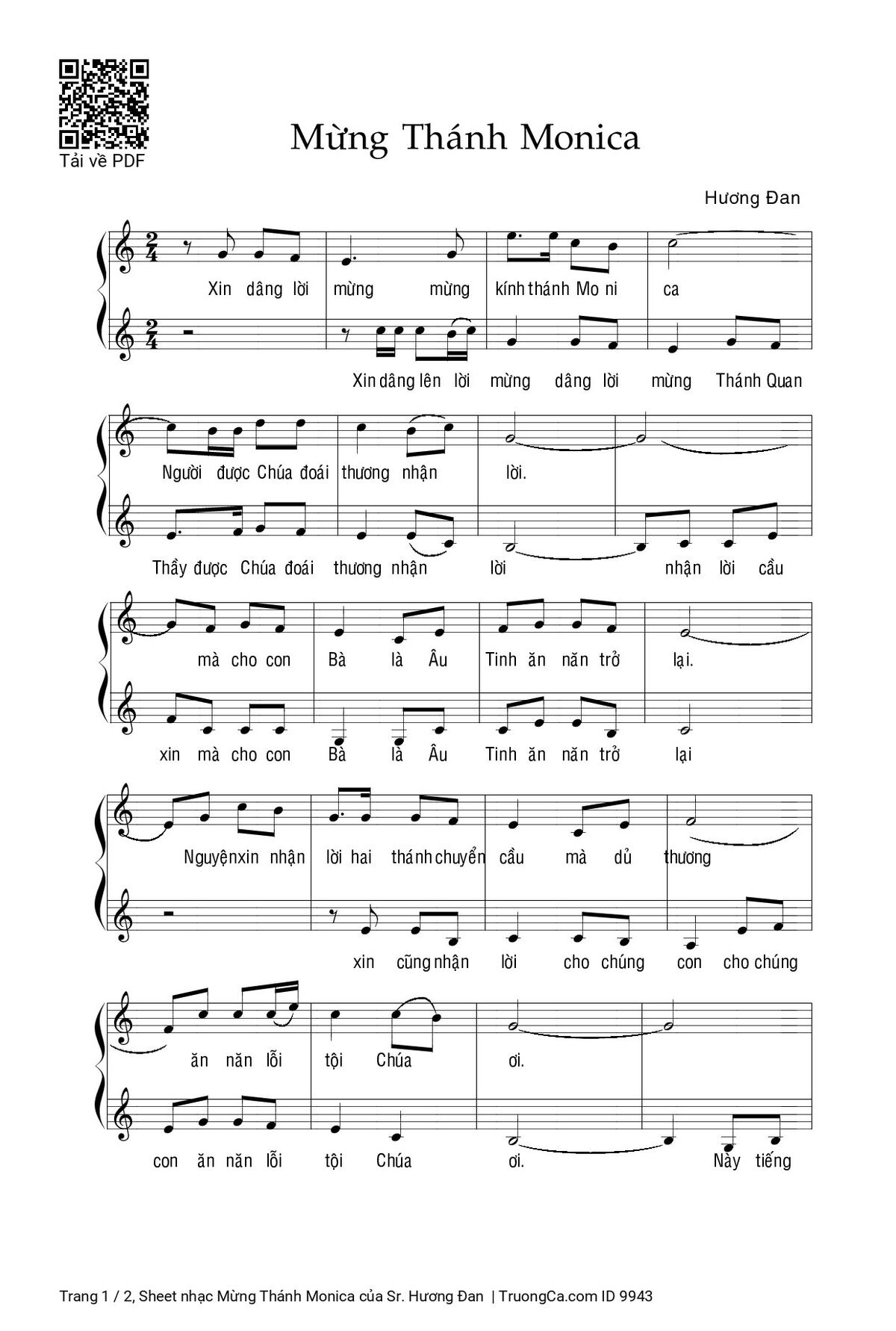 Điệp khúc. Xin dâng lời mừng, mừng kính Thánh Monica. Người được Chúa đoái thương nhận lời. mà cho con bà là Âu Tinh ăn năn trở lại. Nguyện xin nhận lời hai thánh chuyển cầu mà dủ thương Ăn năn lỗi tội Chúa ơi. tha thiết van nài, nguyện tiếng con thấu đến tai Ngài.