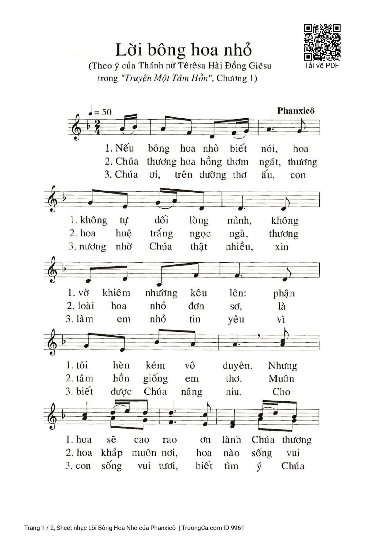 Điệp khúc. Con là hoa nhỏ tầm thường, Chúa dủ thương ban áo quân vương. Bông hoa nhỏ hát lên lời kinh thơ ấu, như em thơ nói cùng người cha yêu thương.