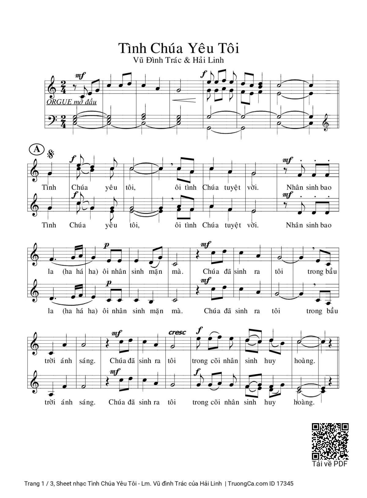 Điệp khúc A. Tình Chúa yêu tôi ôi tình Chúa tuyệt vời! Nhân sinh bao la (ha há ha) ôi nhân sinh mặn mà. Chúa đã sinh ra tôi trong bầu trời ánh sáng. Chúa đã sinh ra tôi trong cõi nhân sinh huy hoàng.