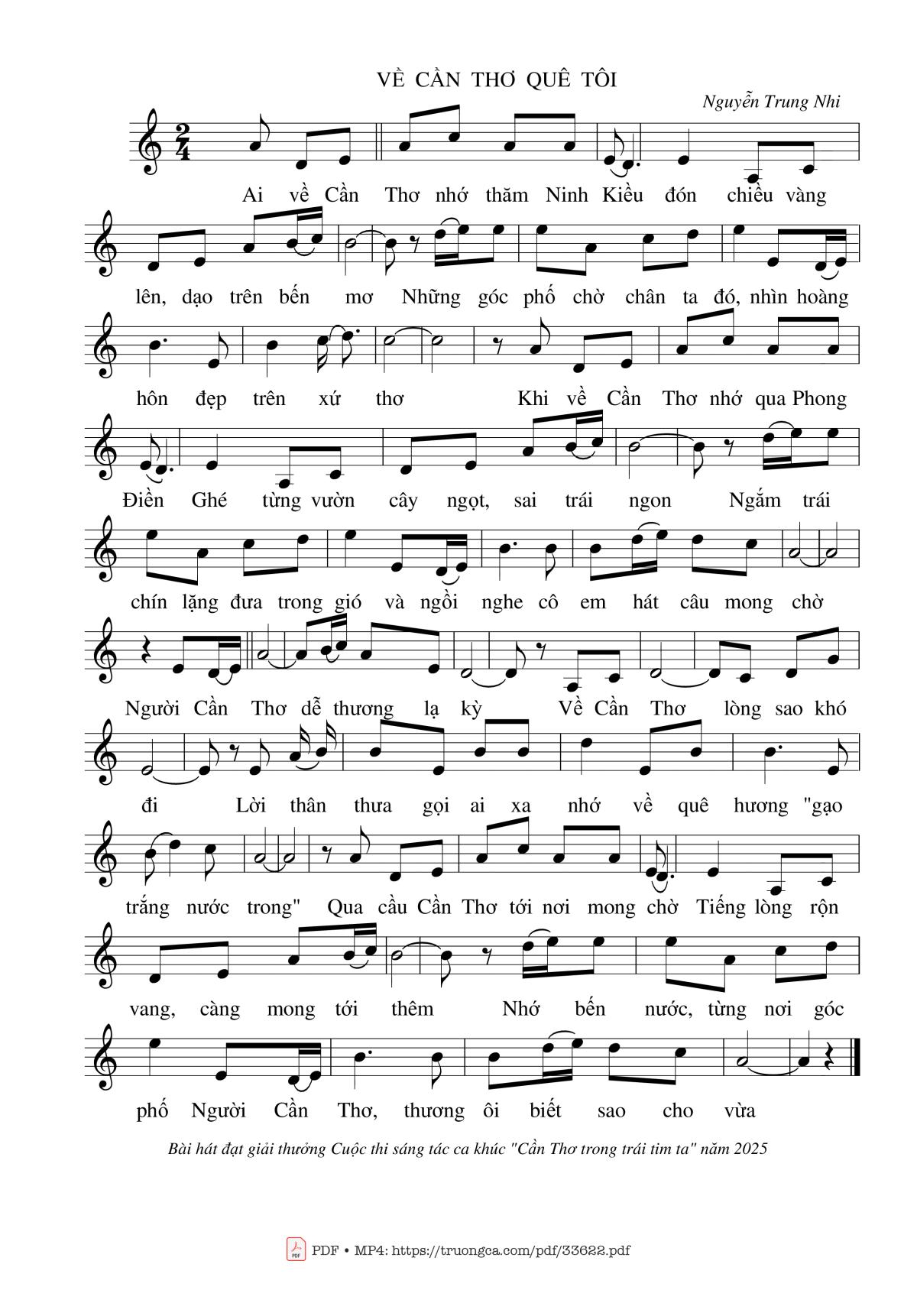 Nguyễn Trung Nhi Ai về Cần Thơ nhớ thăm Ninh Kiều Đón chiều vàng lên [PDF] [Sheet] [Lyrics] [Mp4/Midi]
