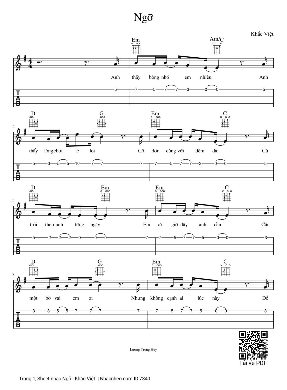 Transposition is the process of moving a song's melody and chords up or down in pitch by a constant interval. The direction of the transposition tool is indicated by a plus (+) sign for up and a minus (-) sign for down. Hover mouse over chords signs to see the chords chart of Ngỡ Guitar solo song.