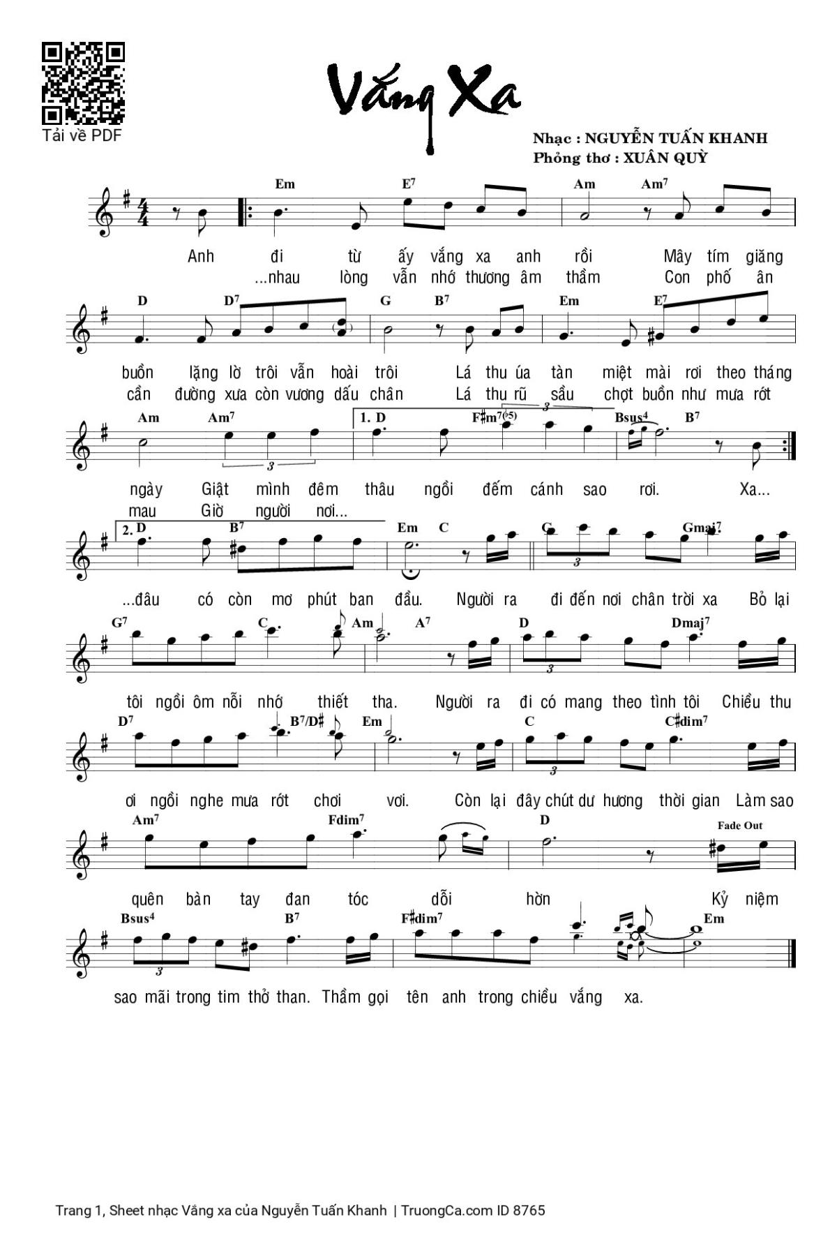 The Videos/audios Vắng xa by Nguyễn Tuấn Khanh were embed from Youtube, Musescore or the other 3rd links. Videos are subject to 3rd's copyright control and may be removed by YouTube's copyright rules and 3rd's policies or maybe included advertisements. If you cannot access to these songs, this mean that have been removed.