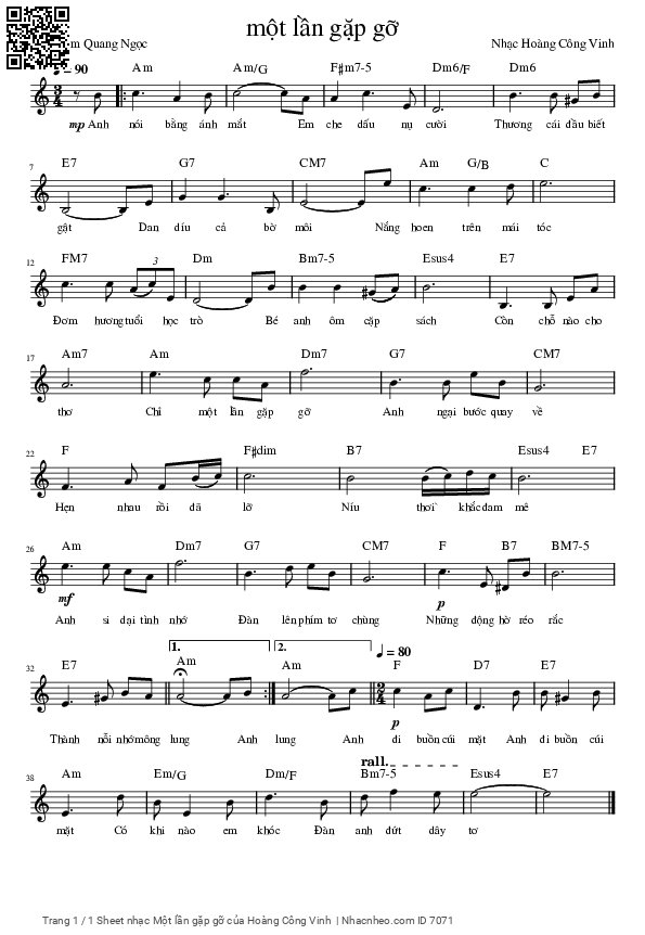 The Videos/audios Một lần gặp gỡ by Hoàng Công Vinh were embed from Youtube, Musescore or the other 3rd links. Videos are subject to 3rd's copyright control and may be removed by YouTube's copyright rules and 3rd's policies or maybe included advertisements. If you cannot access to these songs, this mean that have been removed.