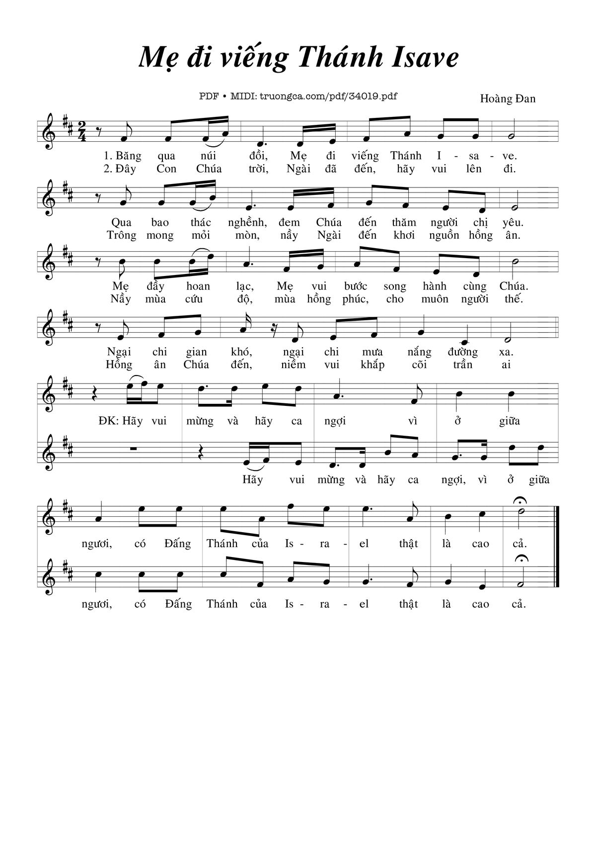 1. Băng qua núi đồi, Mẹ đi viếng Thánh I-sa-ve. Qua bao thác nghềnh, đem Chúa đến thăm người chị yêu. Mẹ đầy hoan lạc, Mẹ vui bước song hành cùng Chúa. Ngại chi gian khó, ngại chi mưa nắng đường xa.
