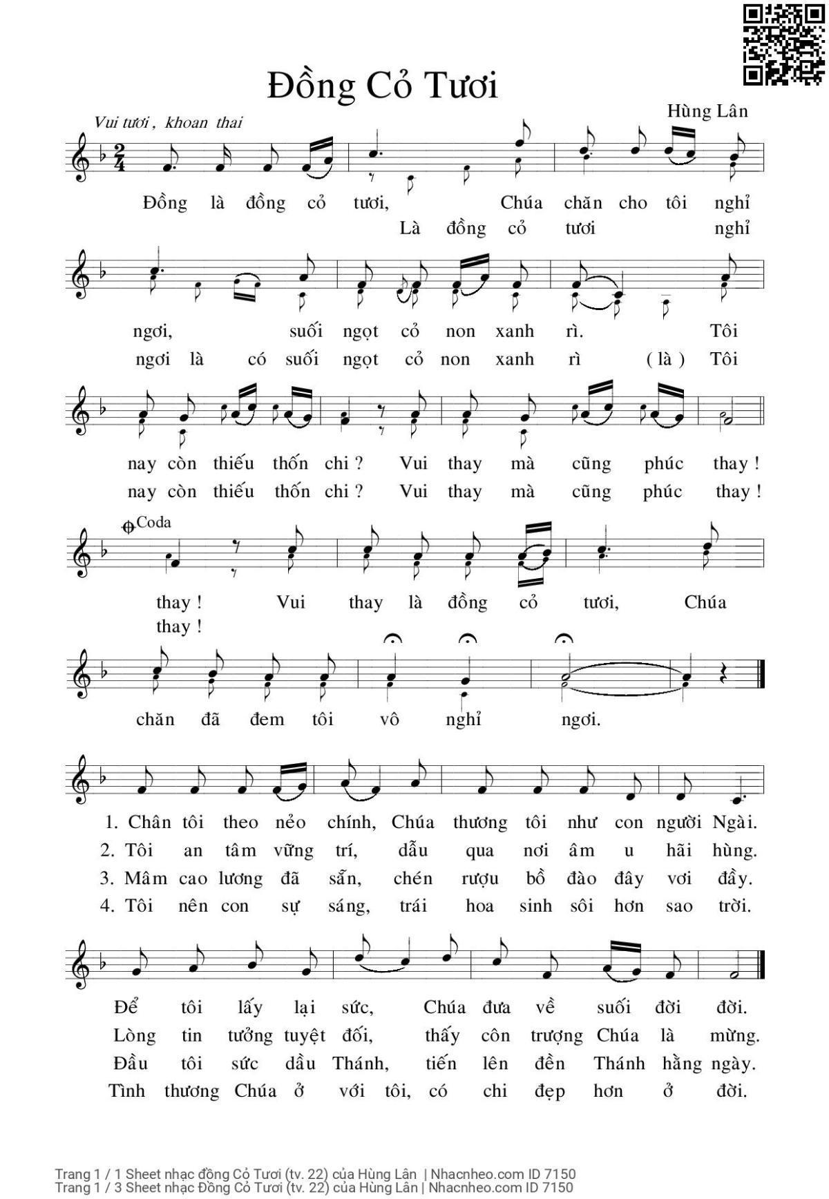 Đồng là đồng cỏ tươi, Chúa chăn cho tôi nghỉ ngơi Suối ngọt cỏ non xanh rì, tôi nay còn thiếu thốn chi? Vui thay mà cũng phúc thay Vui thay là đồng cỏ tươi, Chúa chăn đã đem tôi vô nghỉ ngơi