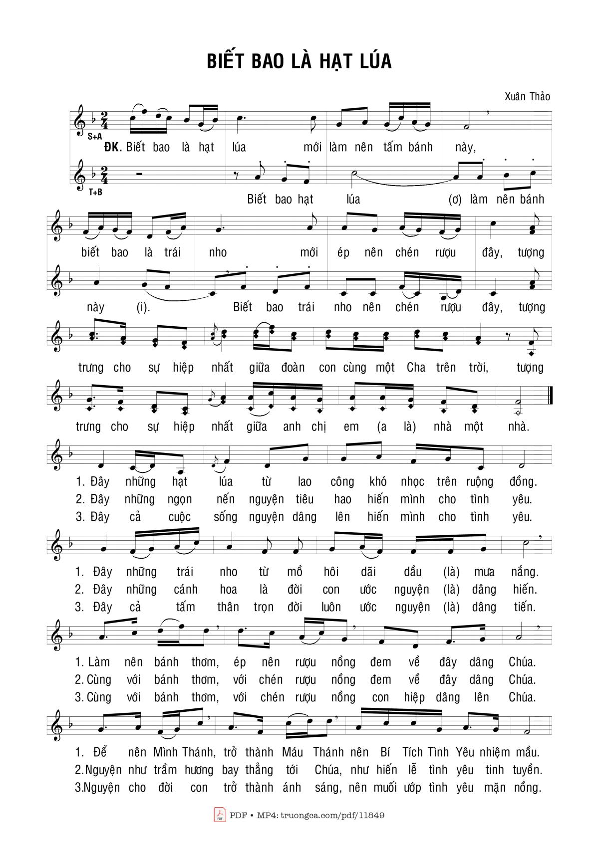 Điệp khúc. Biết bao là hạt lúa mới làm nên tấm bánh này, biết bao là trái nho mới ép nên chén rượu đây, tượng trưng cho sự hiệp nhất giữa đoàn con cùng một Cha trên trời, tượng trưng cho sự hiệp nhất giữa anh chị em (a là) nhà một nhà.
