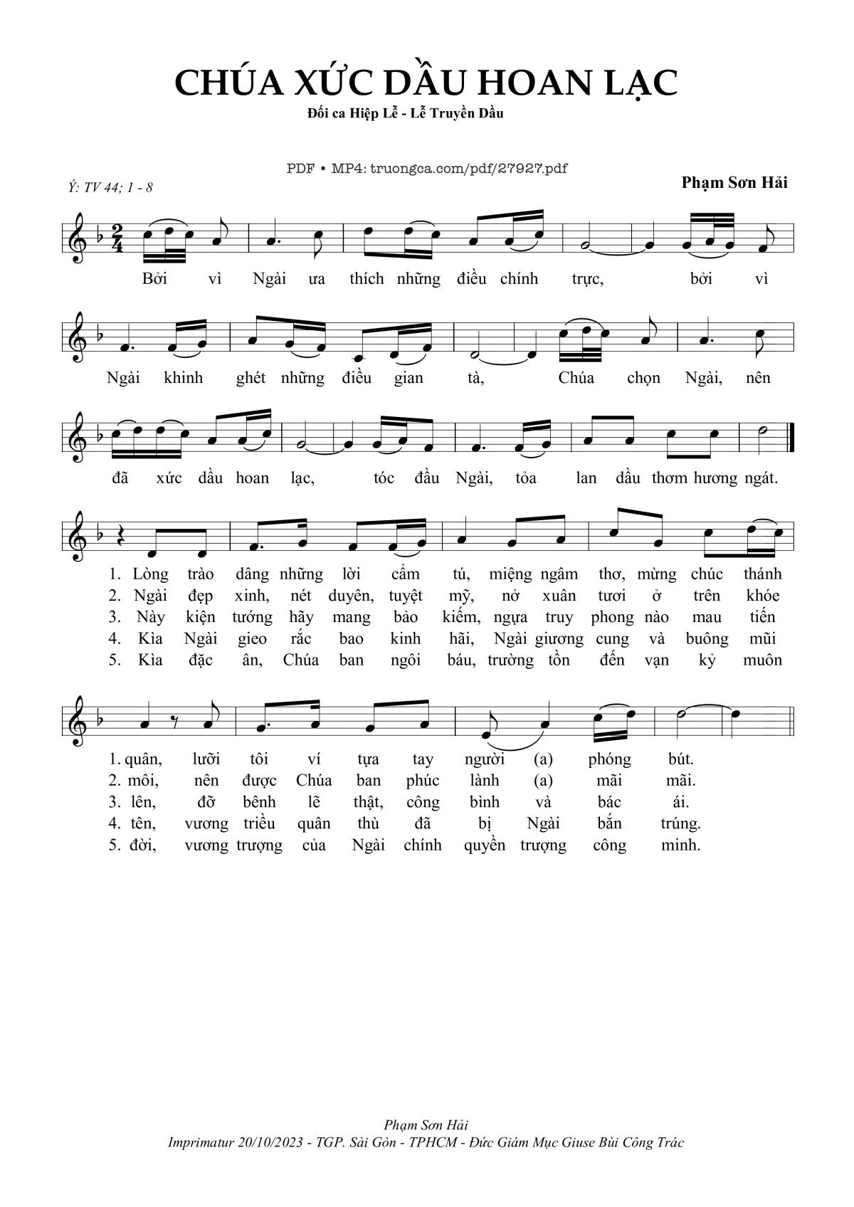 Điệp khúc. Bởi vì Ngài ưa thích những điều chính trực, bởi vì Ngìa khinh ghét những điều gian tà, Chúa chọn Ngài, nên đã xức dầu hoan lạc, tóc đầu Ngài, toả lan dầu thơm hương ngát.