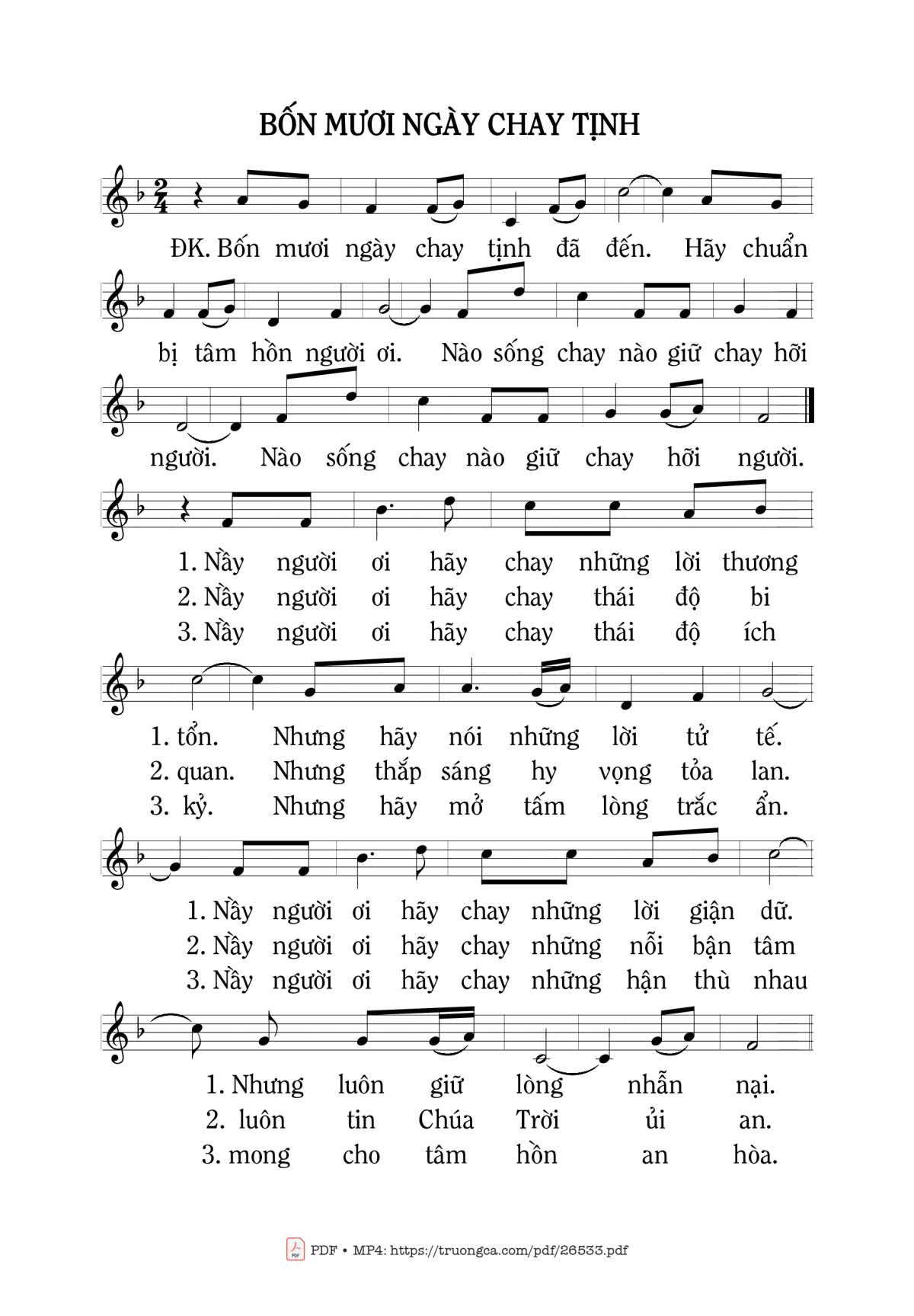 Điệp khúc. Bốn mươi ngày chay tịnh đã đến. Hãy chuẩn bị tâm hồn người ơi. Nào sống chay nào giữ chay hỡi người. Nào sống chay nào giữ chay hỡi người.