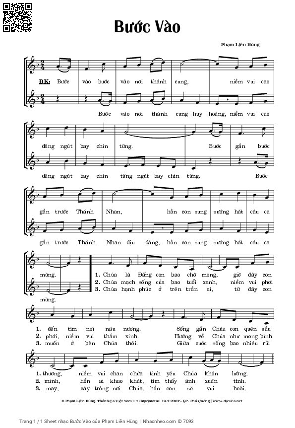 Phạm Liên Hùng Bước vào bước vào nơi thánh cung niềm vui cao dâng ngút bay chín từng [PDF] [Sheet] [Lyrics] [Mp4/Midi]
