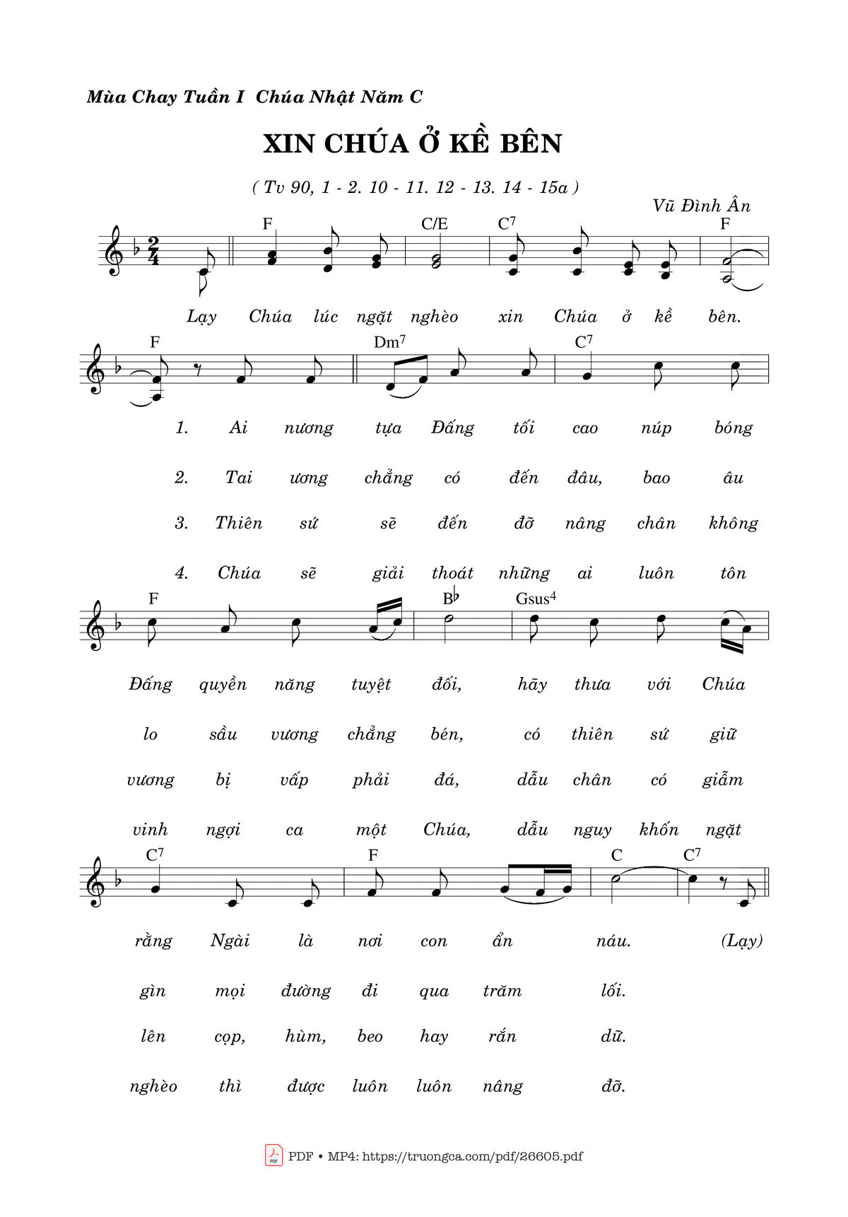 The Videos/audios Thánh Vịnh 90, Xin Chúa Ở Kề Bên by Vũ Đình Ân were embed from Youtube, Musescore or the other 3rd links. Videos are subject to 3rd's copyright control and may be removed by YouTube's copyright rules and 3rd's policies or maybe included advertisements. If you cannot access to these songs, this mean that have been removed.