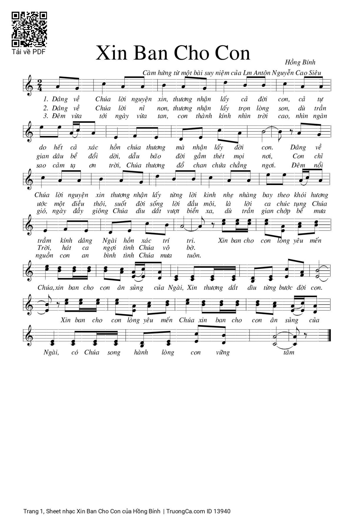 The Videos/audios Xin Ban Cho Con by Hồng Bính were embed from Youtube, Musescore or the other 3rd links. Videos are subject to 3rd's copyright control and may be removed by YouTube's copyright rules and 3rd's policies or maybe included advertisements. If you cannot access to these songs, this mean that have been removed.