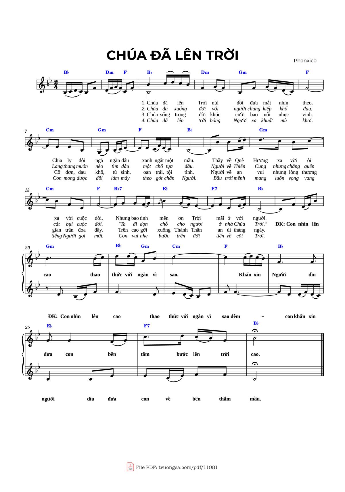 Transposition is the process of moving a song's melody and chords up or down in pitch by a constant interval. The direction of the transposition tool is indicated by a plus (+) sign for up and a minus (-) sign for down. Hover mouse over chords signs to see the chords chart of Chúa đã Lên Trời song.