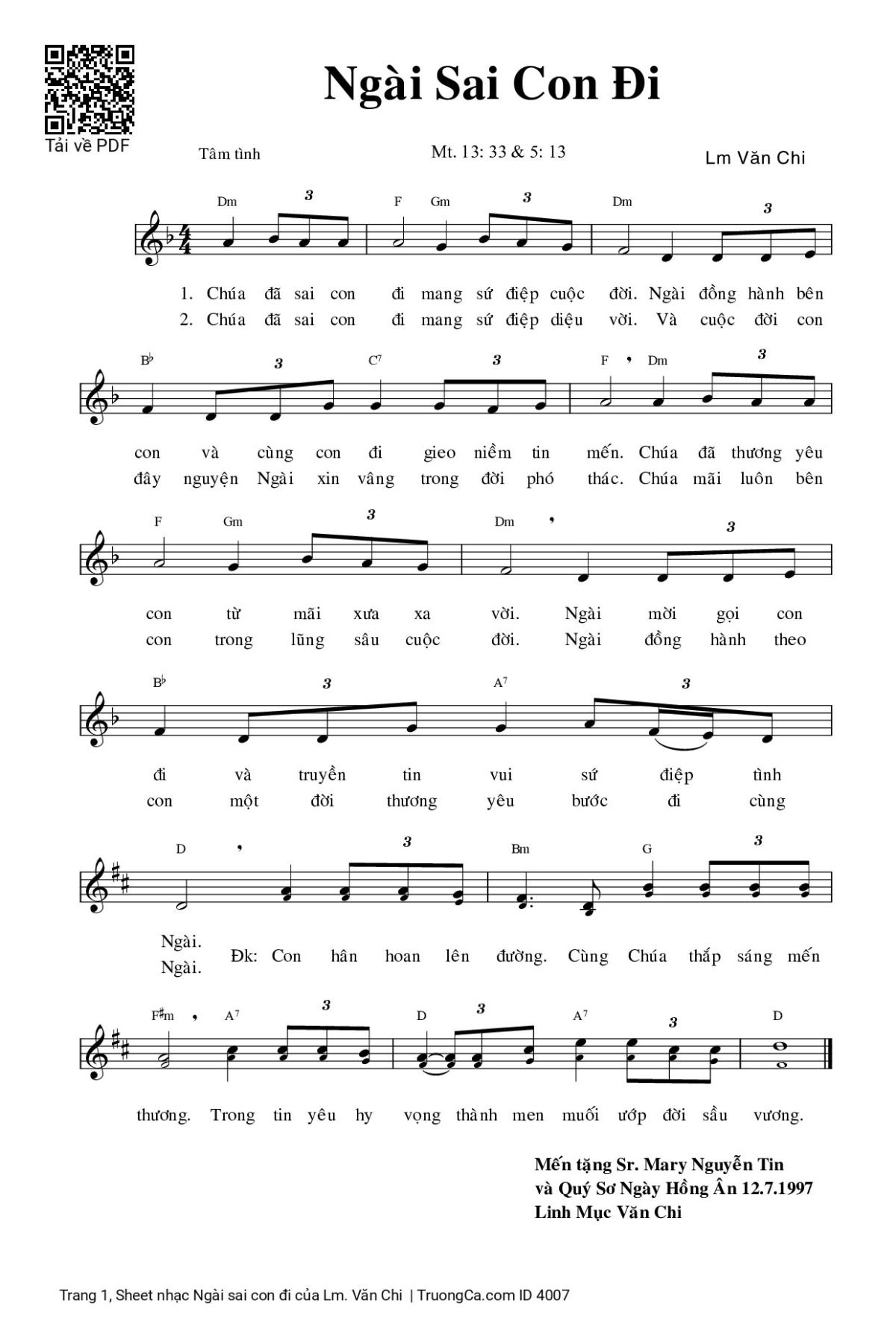 Transposition is the process of moving a song's melody and chords up or down in pitch by a constant interval. The direction of the transposition tool is indicated by a plus (+) sign for up and a minus (-) sign for down. Hover mouse over chords signs to see the chords chart of Ngài sai con đi song.