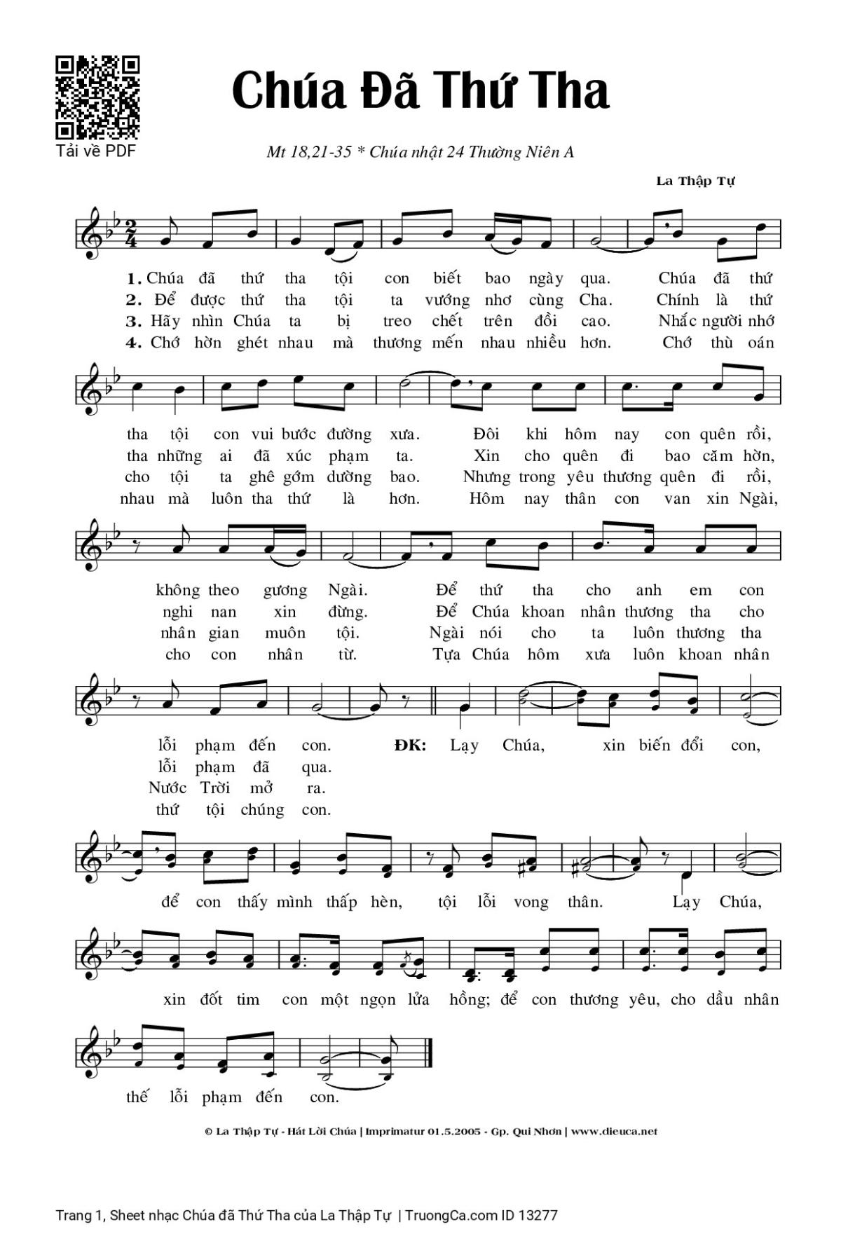 1. Chúa đã thứ tha tội con biết bao ngày qua. Chúa đã thứ tha tội con vui bước đường xưa. Đôi khi hôm nay con quên rồi, không theo gương Ngài. Để thứ tha cho anh em con lỗi phạm đến con.