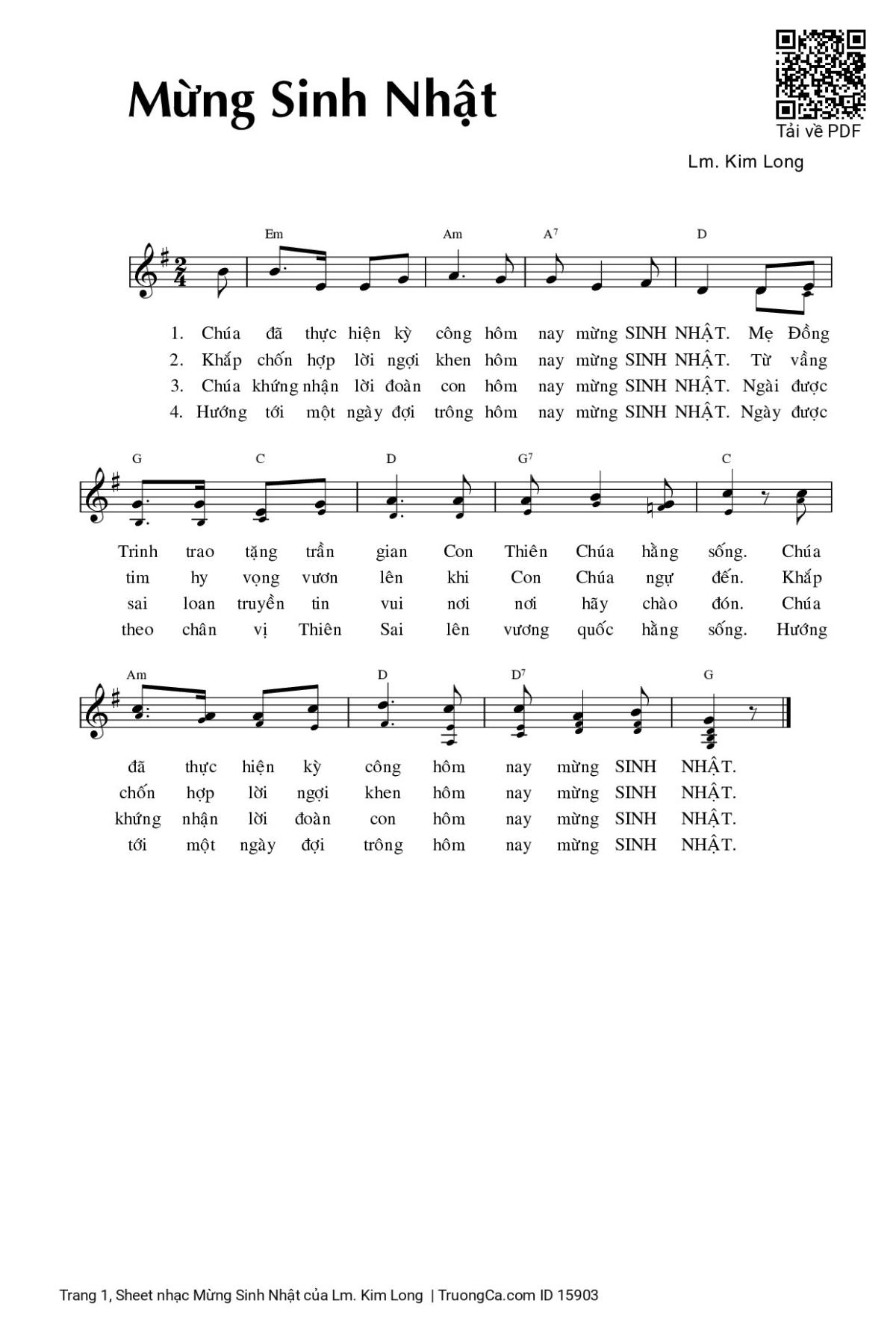 Transposition is the process of moving a song's melody and chords up or down in pitch by a constant interval. The direction of the transposition tool is indicated by a plus (+) sign for up and a minus (-) sign for down. Hover mouse over chords signs to see the chords chart of Mừng Sinh Nhật song.