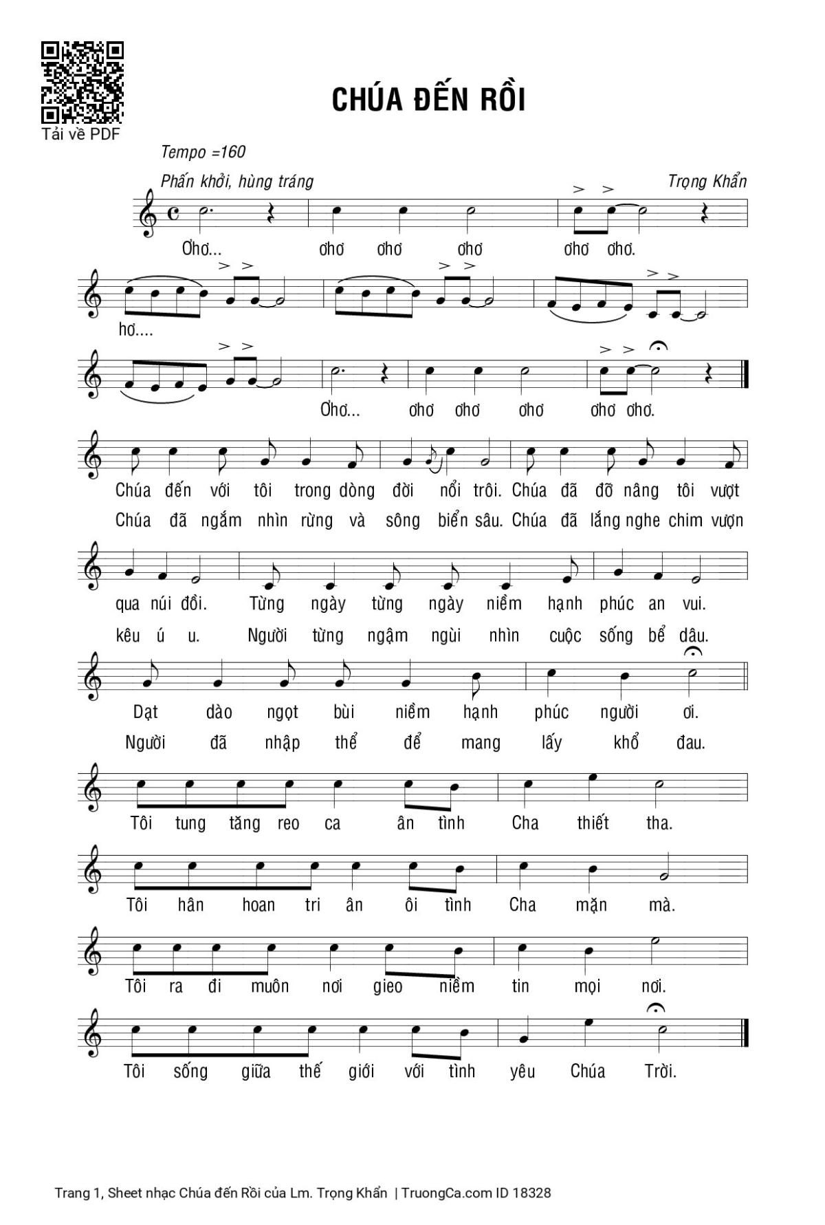 Transposition is the process of moving a song's melody and chords up or down in pitch by a constant interval. The direction of the transposition tool is indicated by a plus (+) sign for up and a minus (-) sign for down. Hover mouse over chords signs to see the chords chart of Chúa đến Rồi song.
