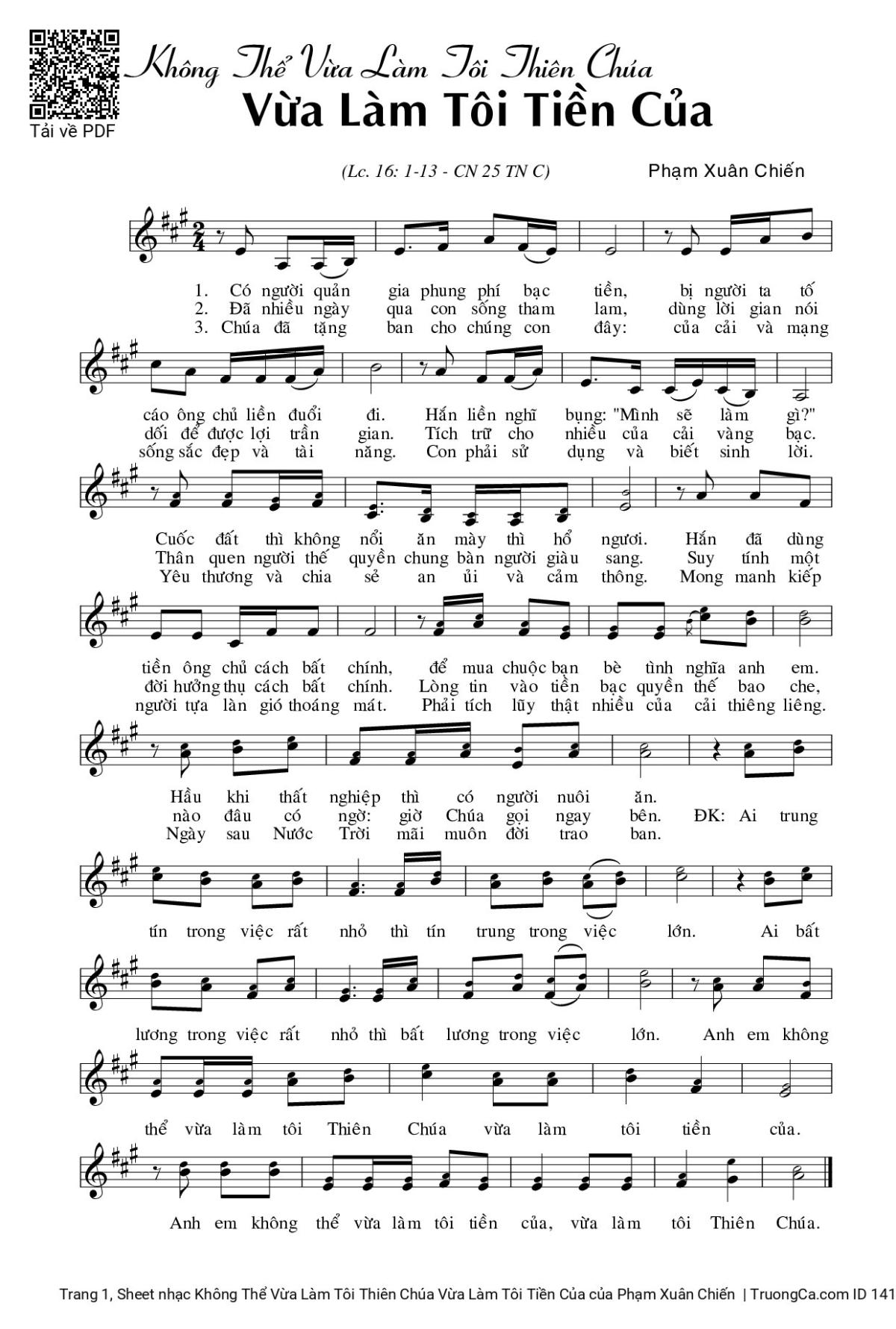 Điệp khúc. Ai trung tín trong việc rất nhỏ thì tín trung trong việc lớn. Ai bất lương trong việc rất nhỏ thì bất lương trong việc lớn. Anh em không thể vừa làm tôi Thiên Chúa vừa làm tôi tiền của. Anh em không thể vừa làm tôi tiền của, vừa làm tôi Thiên Chúa.