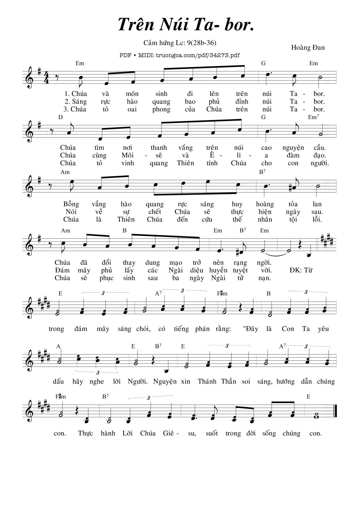 1. Chúa và môn sinh đi lên trên núi Ta-bor. Chúa tìm nơi thanh vắng trên núi cao nguyện cầu. Bỗng vầng hào quang rực sáng huy hoàng tỏa lan. Chúa đã đổi thay dung mạo trở nên rạng ngời.