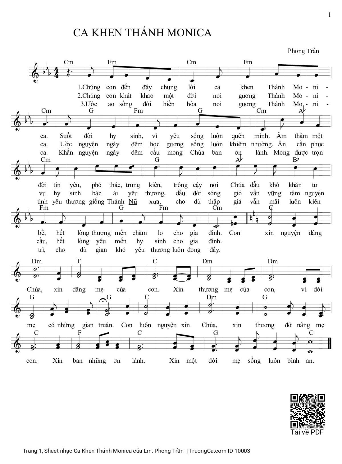 1/ Chúng con đến đây chung lời ca khen Thánh Monica suốt đời hy sinh vì yêu sống luôn quên mình, âm thầm một đời tin yêu phó thác trung kiên, trông cậy nơi Chúa dẫu khó khăn tứ bề, hết lòng thương mến chăm lo cho gia đình.