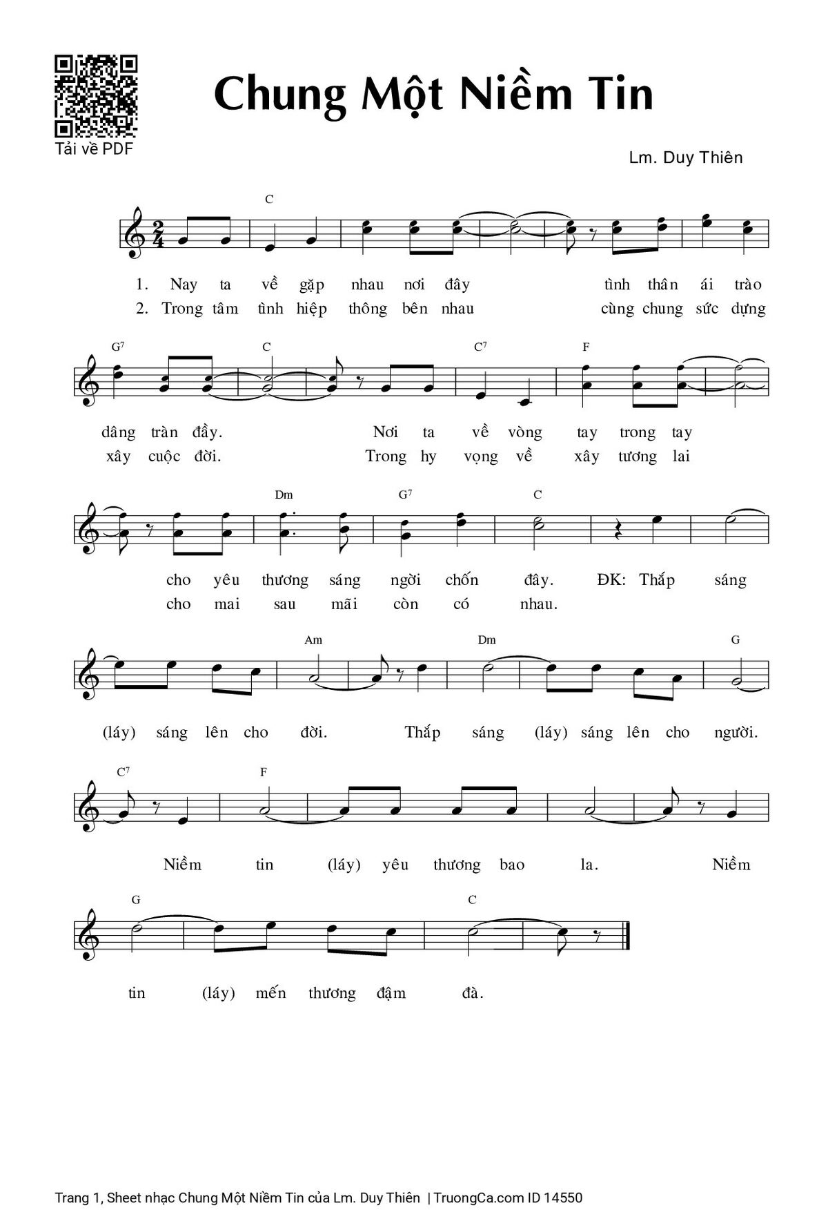 Điệp khúc: Thắp sáng, sáng lên cho đời. Thắp sáng, sáng lên cho người. Niềm tin, yêu thương bao la. Niềm tin mến thương đậm đà.
