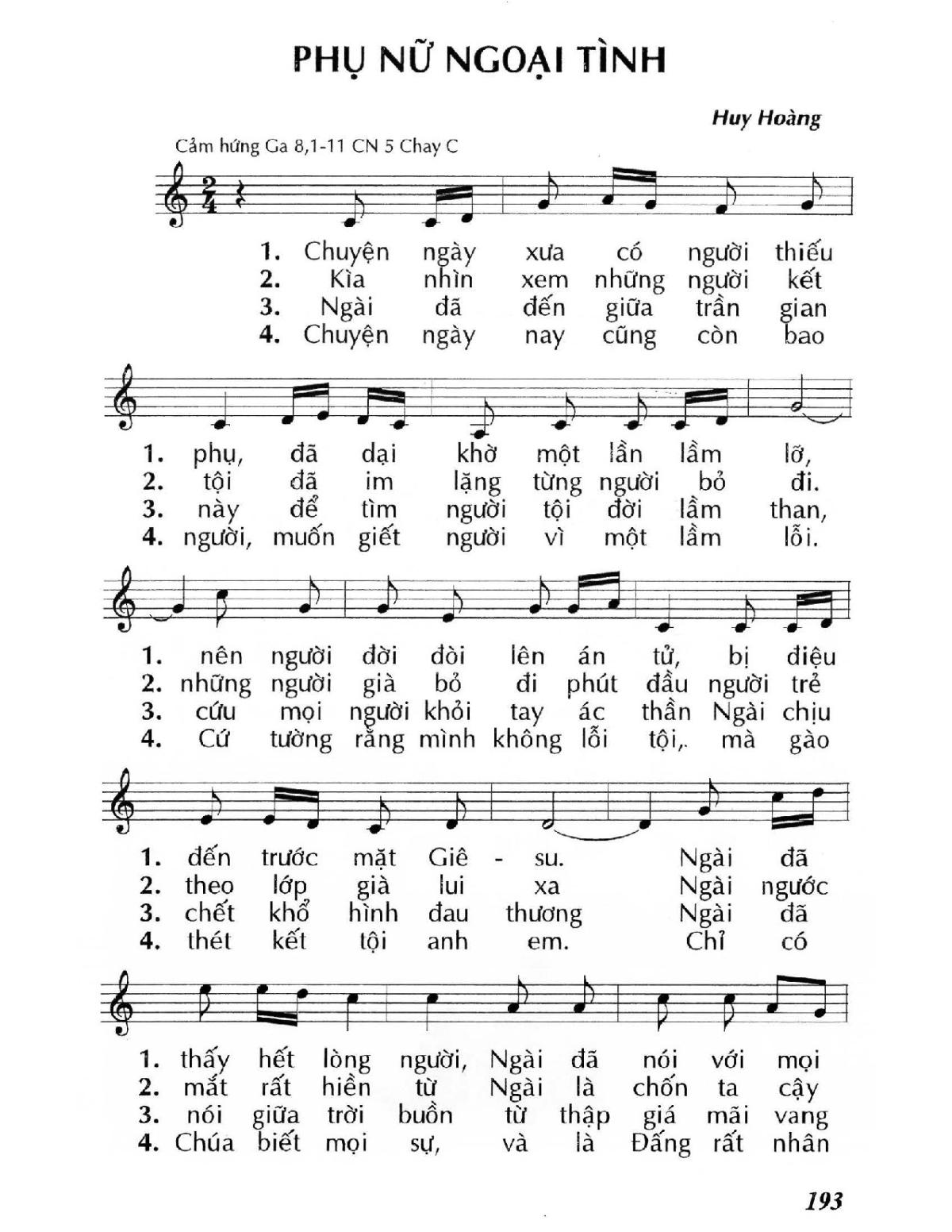 1. Chuyện ngày xưa có người thiếu phụ, đã dại khờ một lần lầm lỡ, nên người đời đòi lên án tử, bị điệu đến trước mặt Giê-su. Ngài đã thấy hết lòng người, Ngài đã nói với mọi người: Ai cho mình vô tội thì hãy ném đá chị này trước đi.