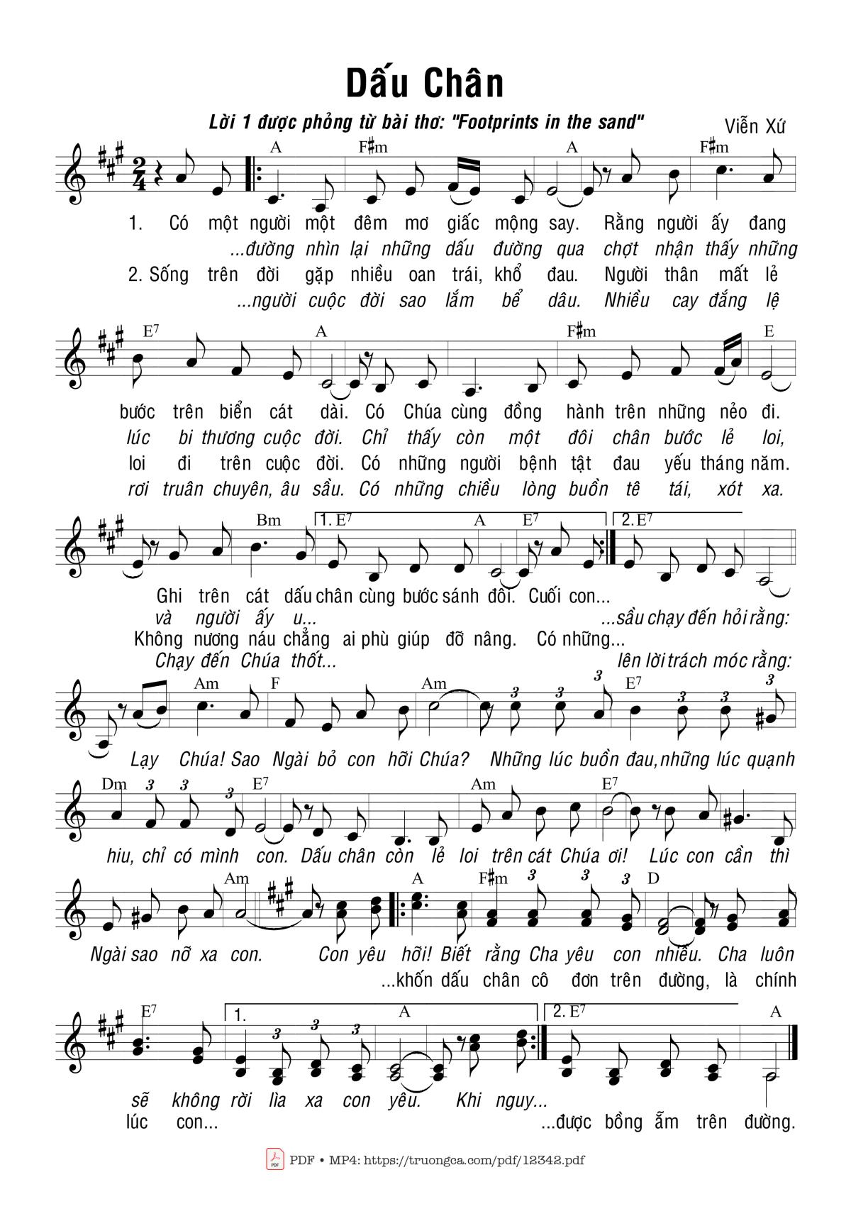 Điệp khúc. Cuối con đường nhìn lại nhãng dấu đường qua, chợt nhận thấy, những lúc bi thương cuộc đời. Chỉ thấy còn một đôi chân bước lẻ loi. Và người ấy u sầu chạy đến hỏi rằng: Lạy Chúa sao Ngài bỏ con hỡi Chúa! Những lúc buồn đau những lúc quạnh hiu, chỉ có mình con. Dấu chân còn lẻ loi trên cát Chúa ơi! Lúc con cần, thì Ngài sao nỡ xa con.
