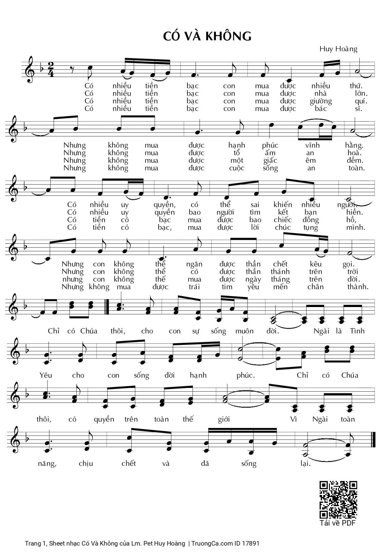 Transposition is the process of moving a song's melody and chords up or down in pitch by a constant interval. The direction of the transposition tool is indicated by a plus (+) sign for up and a minus (-) sign for down. Hover mouse over chords signs to see the chords chart of Có Và Không song.