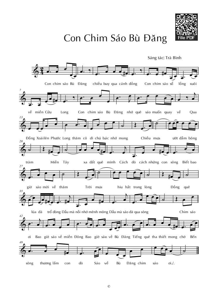 Trà Bình Con chim sáo Bù Đăng Chiều bay qua cánh đồng [PDF] [Sheet] [Lyrics] [Mp4/Midi]