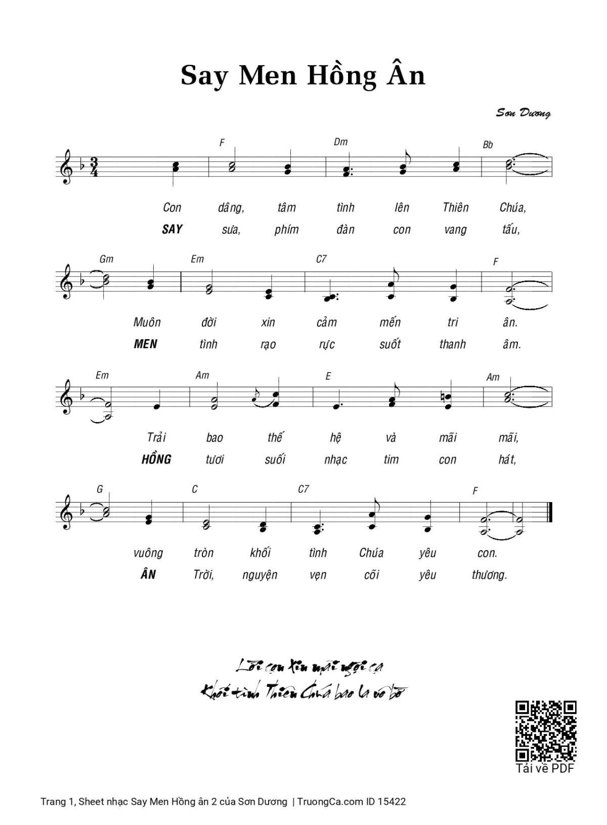 Transposition is the process of moving a song's melody and chords up or down in pitch by a constant interval. The direction of the transposition tool is indicated by a plus (+) sign for up and a minus (-) sign for down. Hover mouse over chords signs to see the chords chart of Say Men Hồng ân 2 song.