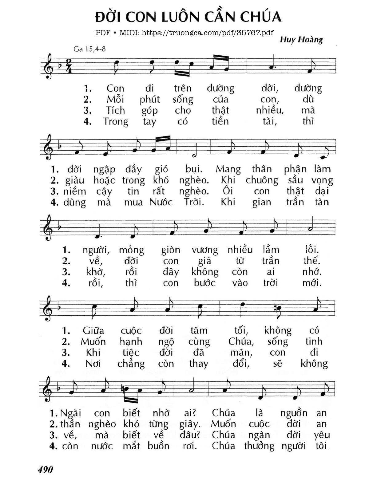 Điệp khúc: Đời con luôn cần Chúa, như đất khô cần nước nguồn. Để vắng Chúa trong hồn, con như sông cạn nước trên ngàn. Muốn cuộc đời bình an, thì hồn con luôn cần có Chúa. Giữa biển dậy sóng gió, con xa Ngài, đời biết đâu bến bờ?