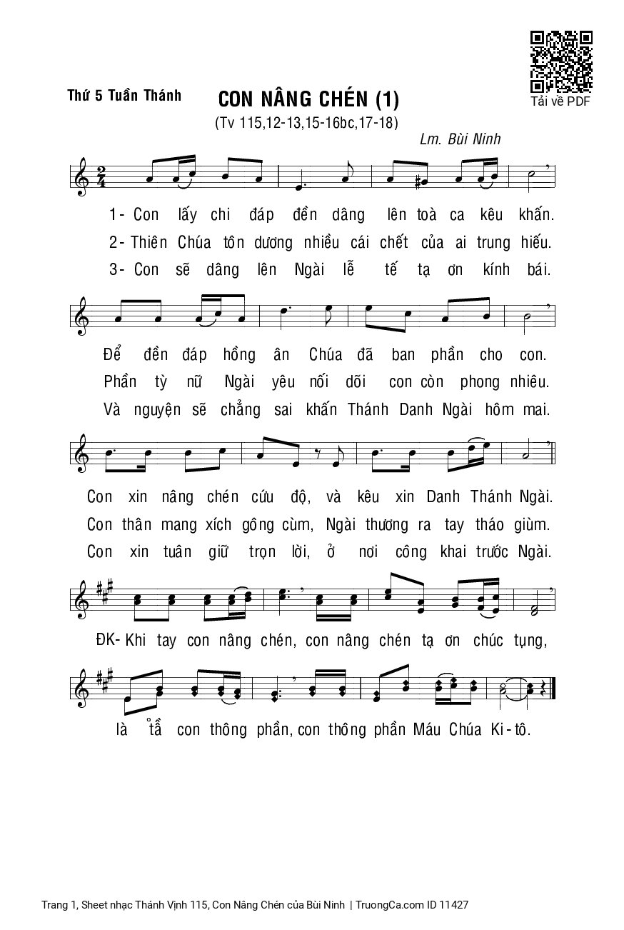 The Videos/audios Thánh Vịnh 115, Con Nâng Chén by Bùi Ninh were embed from Youtube, Musescore or the other 3rd links. Videos are subject to 3rd's copyright control and may be removed by YouTube's copyright rules and 3rd's policies or maybe included advertisements. If you cannot access to these songs, this mean that have been removed.