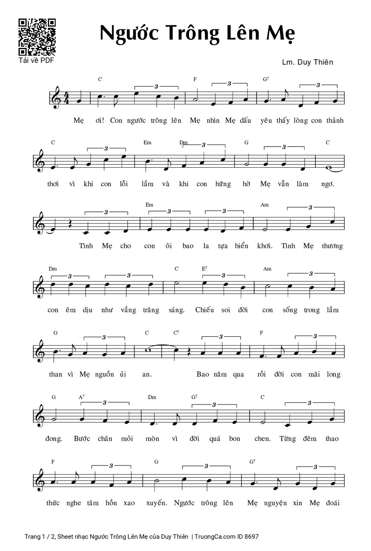 Duy Thiên Con ngước trông lên Mẹ nhìn Mẹ dấu yêu thấy lòng con thảnh thơi vì khi con lỗi lầm và khi con hững hờ [PDF] [Sheet] [Lyrics] [Mp4/Midi]