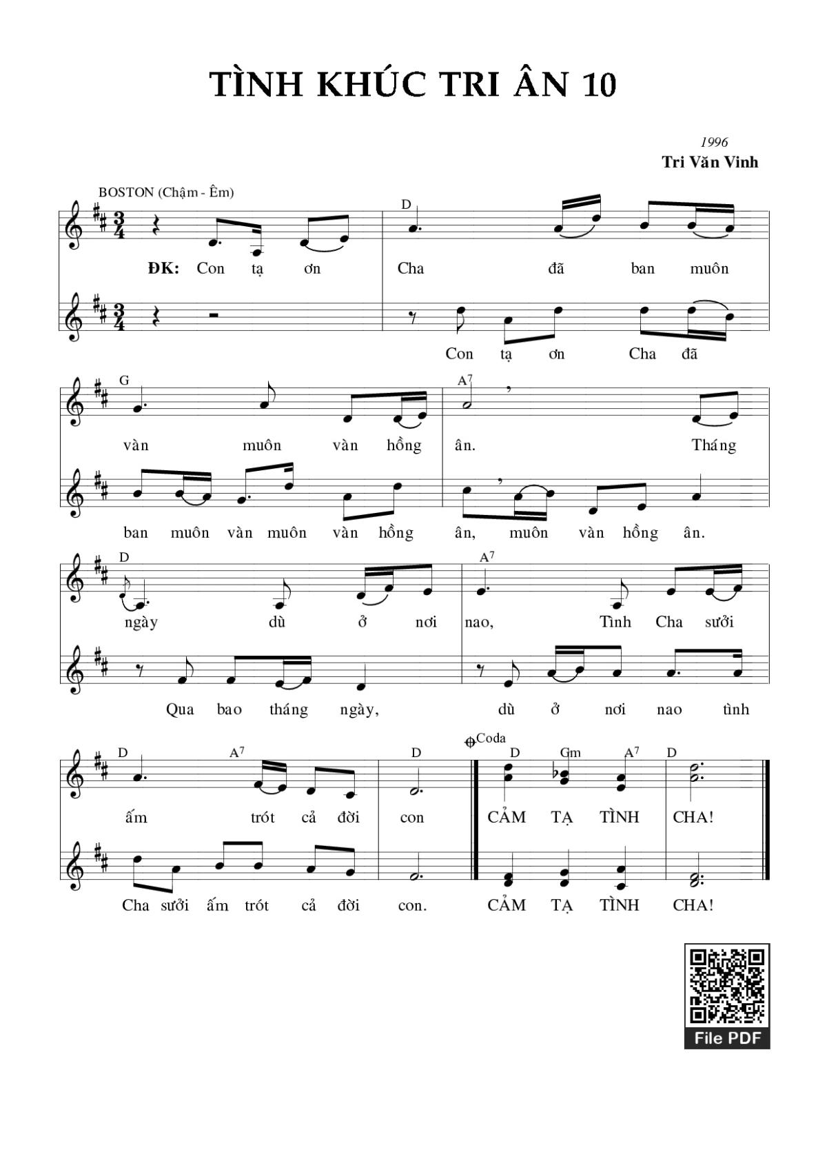 Điệp khúc: Con tạ ơn Cha đã ban muôn vàn muôn vàn hồng ân. Tháng ngày dù ở nơi nao, Tình Cha sưởi ấm suốt cả đời con. Cảm tạ tình Cha.