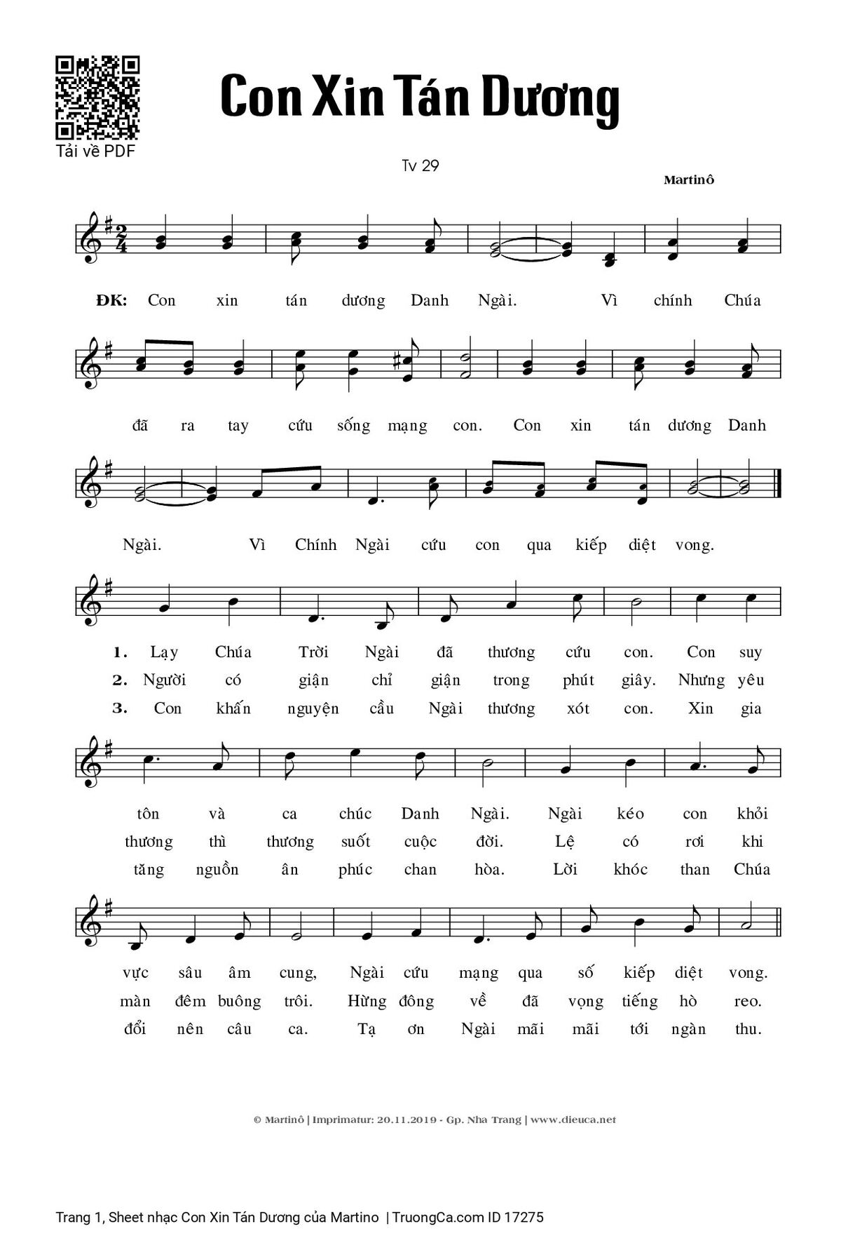 Transposition is the process of moving a song's melody and chords up or down in pitch by a constant interval. The direction of the transposition tool is indicated by a plus (+) sign for up and a minus (-) sign for down. Hover mouse over chords signs to see the chords chart of Con Xin Tán Dương song.